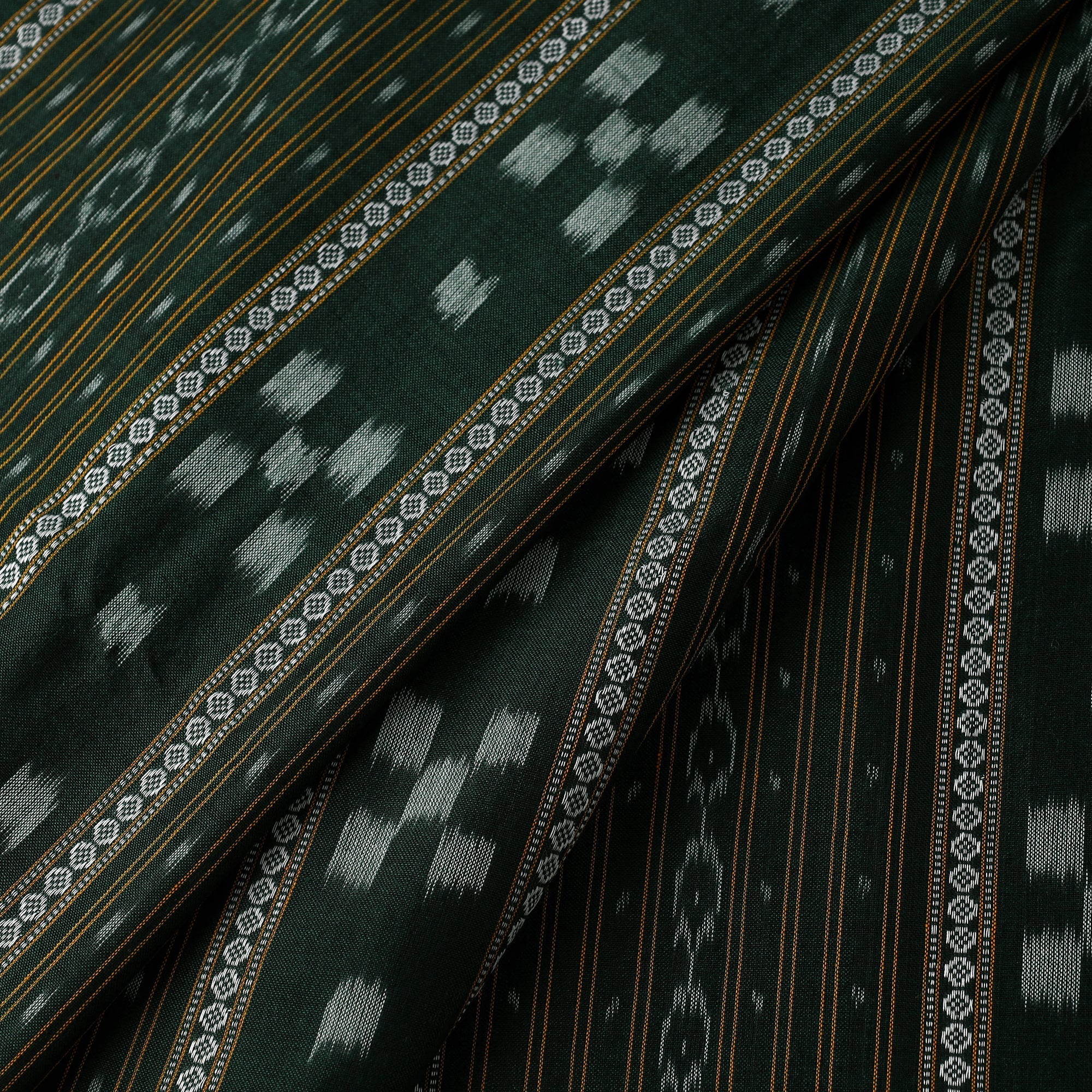 Green sambalpuri Ikat cotton fabric from Odisha features traditional motifs like shankha, chakra, and phula. Crafted by skilled artisans of eastern India using the Ikat technique, where threads are resist-dyed before weaving. This breathable fabric is easy to stitch, making it perfect for kurtas, dresses, or home decor.