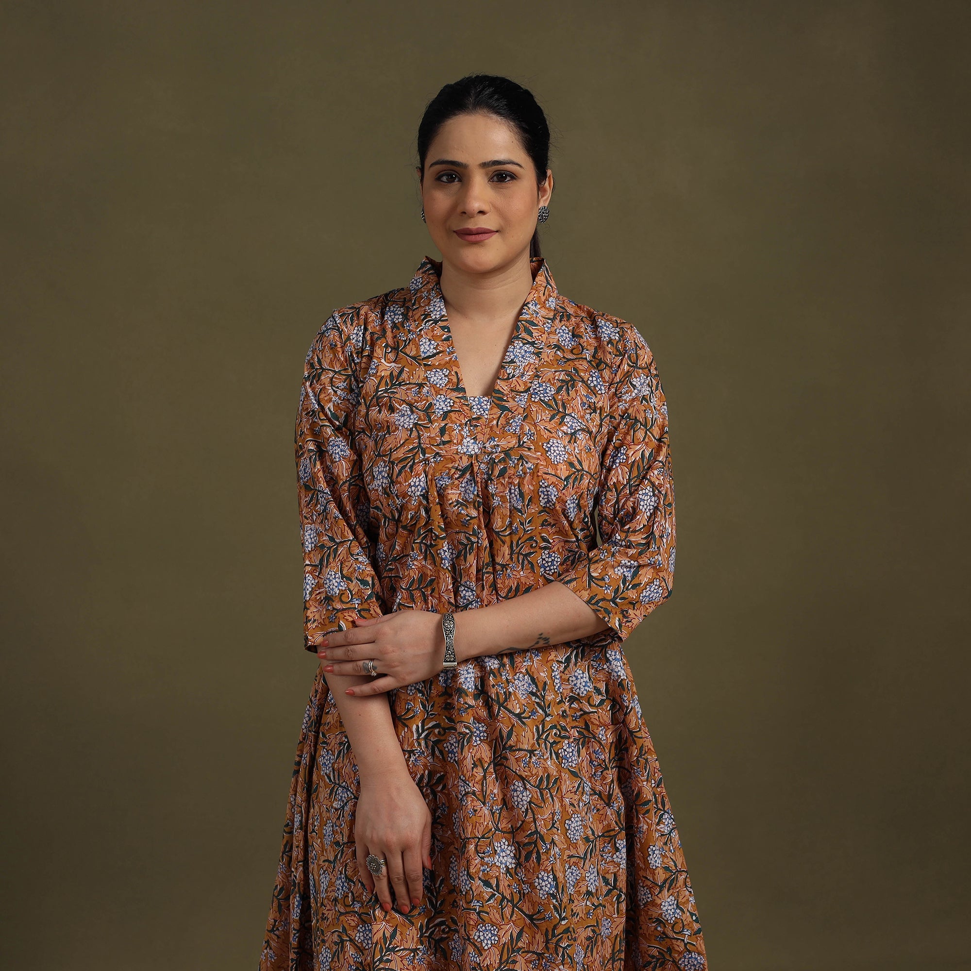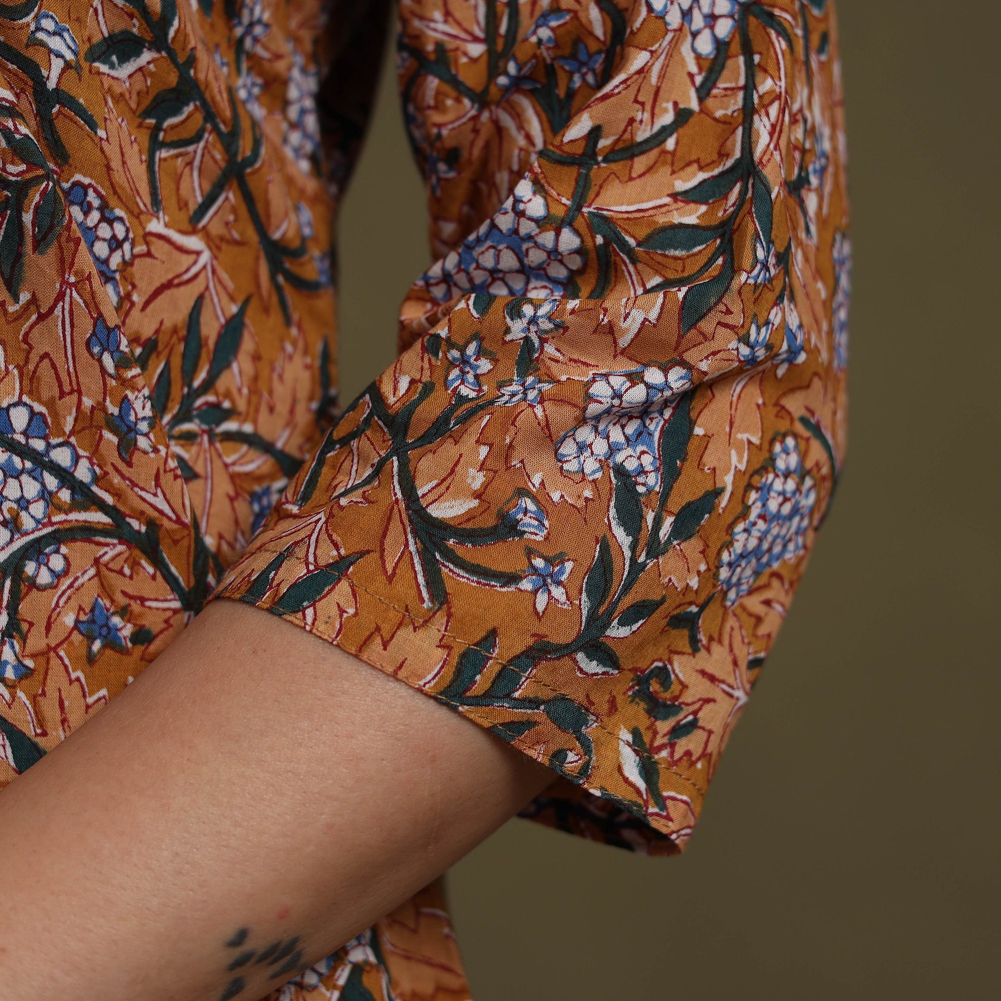 Stay stylish and comfortable in this brown sanganeri cotton co-ord set, adorned with delicate floral block prints rooted in Rajasthan’s heritage. The set includes a breathable cotton top and palazzos with an elasticized waist for a perfect fit, along with side pockets for added convenience. Whether for work, brunch, or a festive gathering, this block print co-ord set offers effortless elegance.