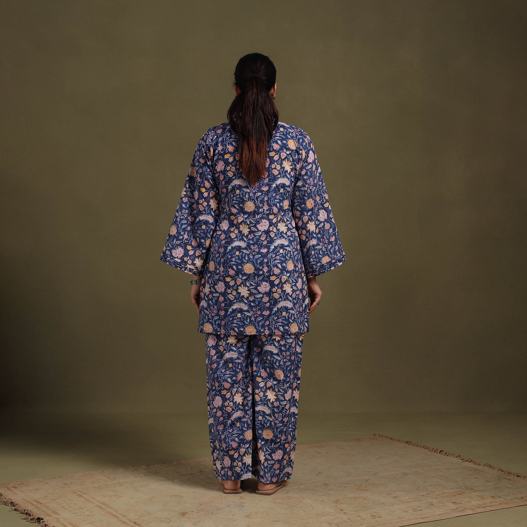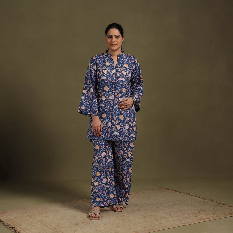 Stay stylish and comfortable in this blue sanganeri cotton co-ord set, adorned with delicate floral block prints rooted in Rajasthan’s heritage. The set includes a breathable cotton top and palazzos with an elasticized waist for a perfect fit, along with side pockets for added convenience. Whether for work, brunch, or a festive gathering, this block print co-ord set offers effortless elegance.