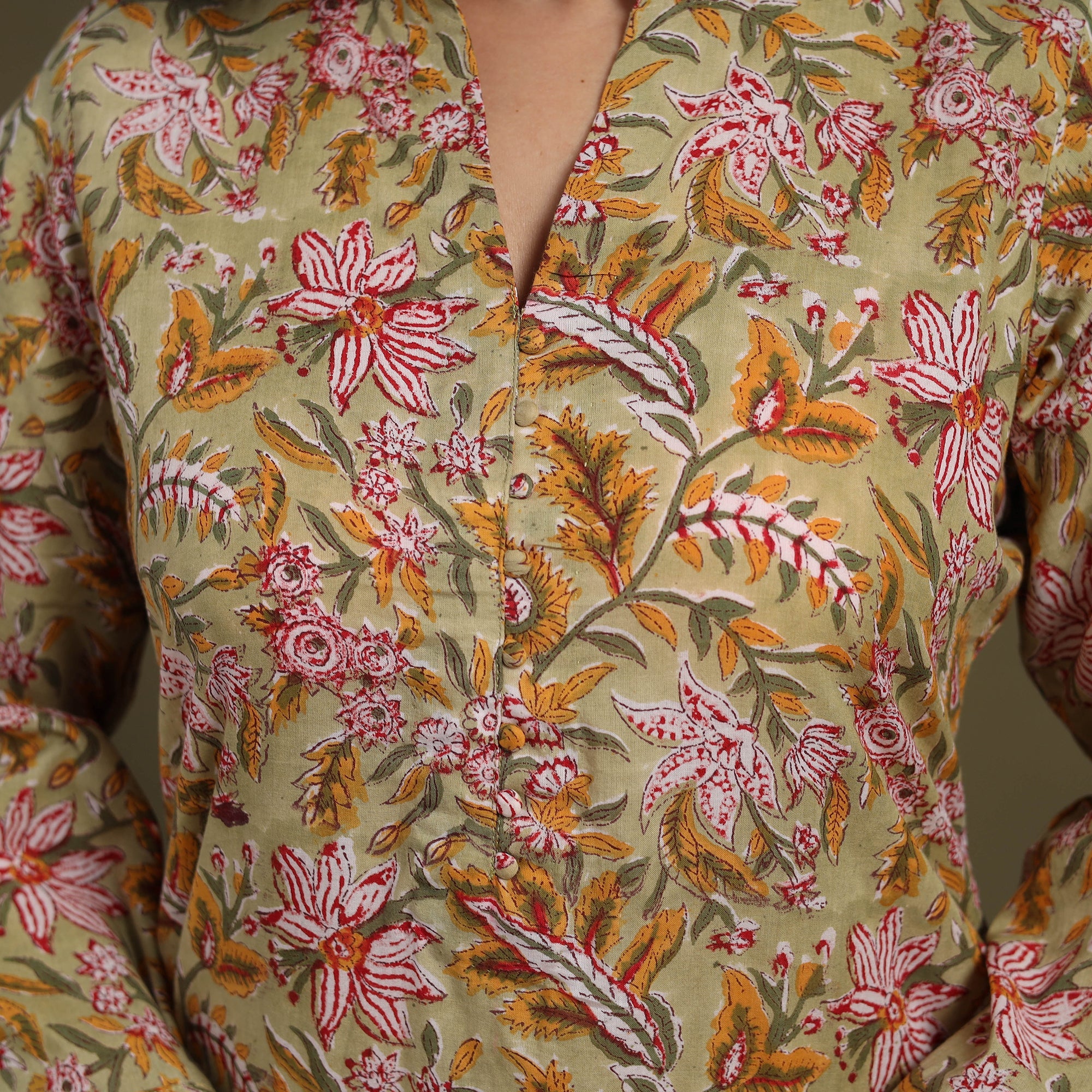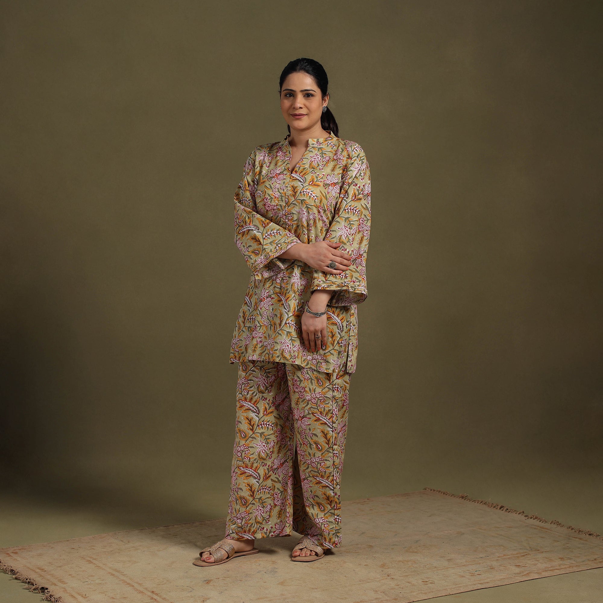 Stay stylish and comfortable in this green sanganeri cotton co-ord set, adorned with delicate floral block prints rooted in Rajasthan’s heritage. The set includes a breathable cotton top and palazzos with an elasticized waist for a perfect fit, along with side pockets for added convenience. Whether for work, brunch, or a festive gathering, this block print co-ord set offers effortless elegance.