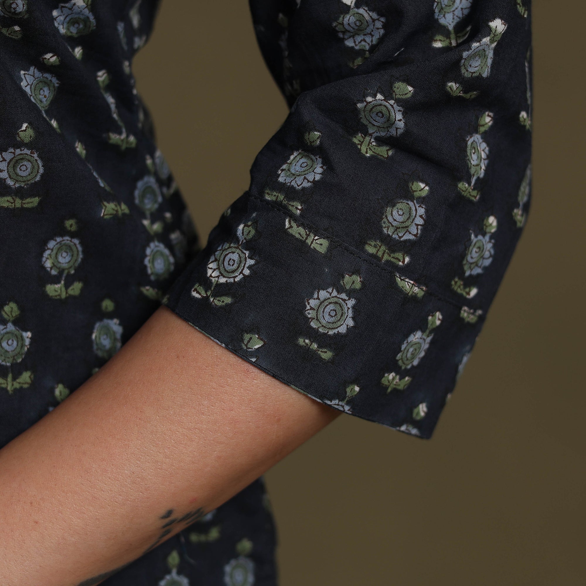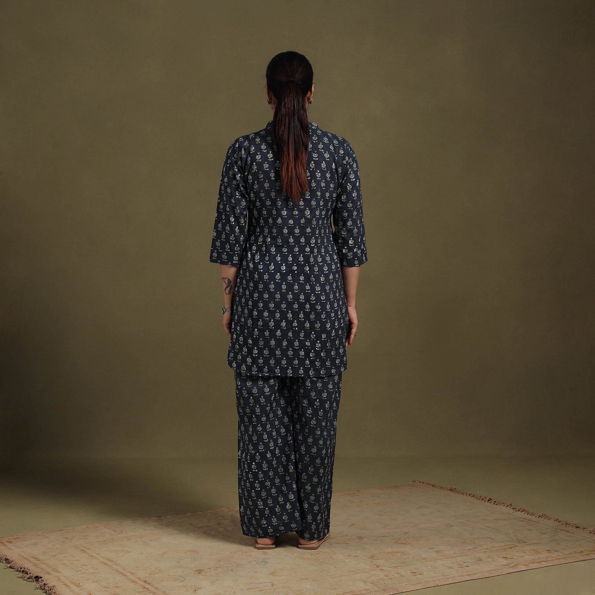 Stay stylish and comfortable in this blue sanganeri cotton co-ord set, adorned with delicate floral block prints rooted in Rajasthan’s heritage. The set includes a breathable cotton top and palazzos with an elasticized waist for a perfect fit, along with side pockets for added convenience. Whether for work, brunch, or a festive gathering, this block print co-ord set offers effortless elegance.