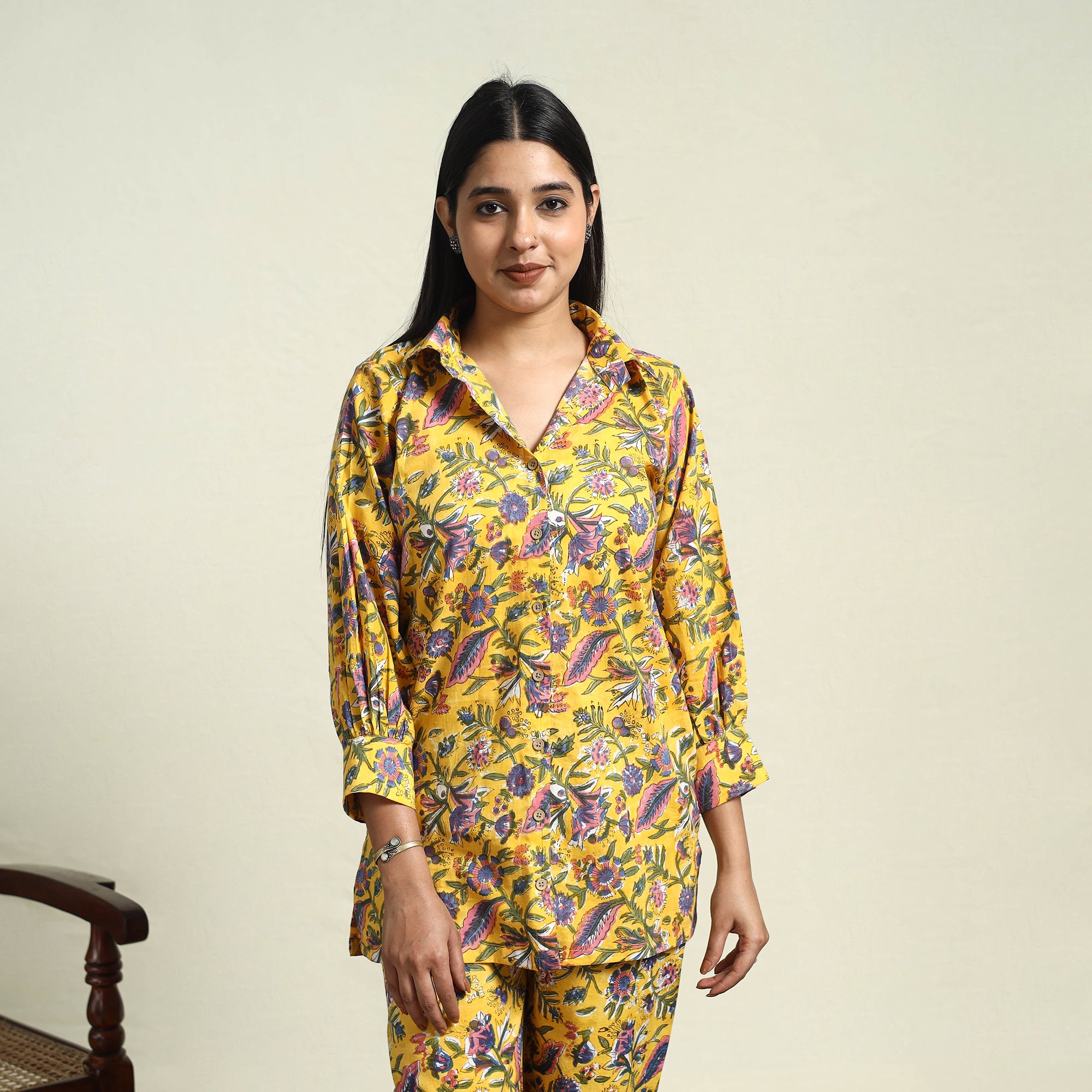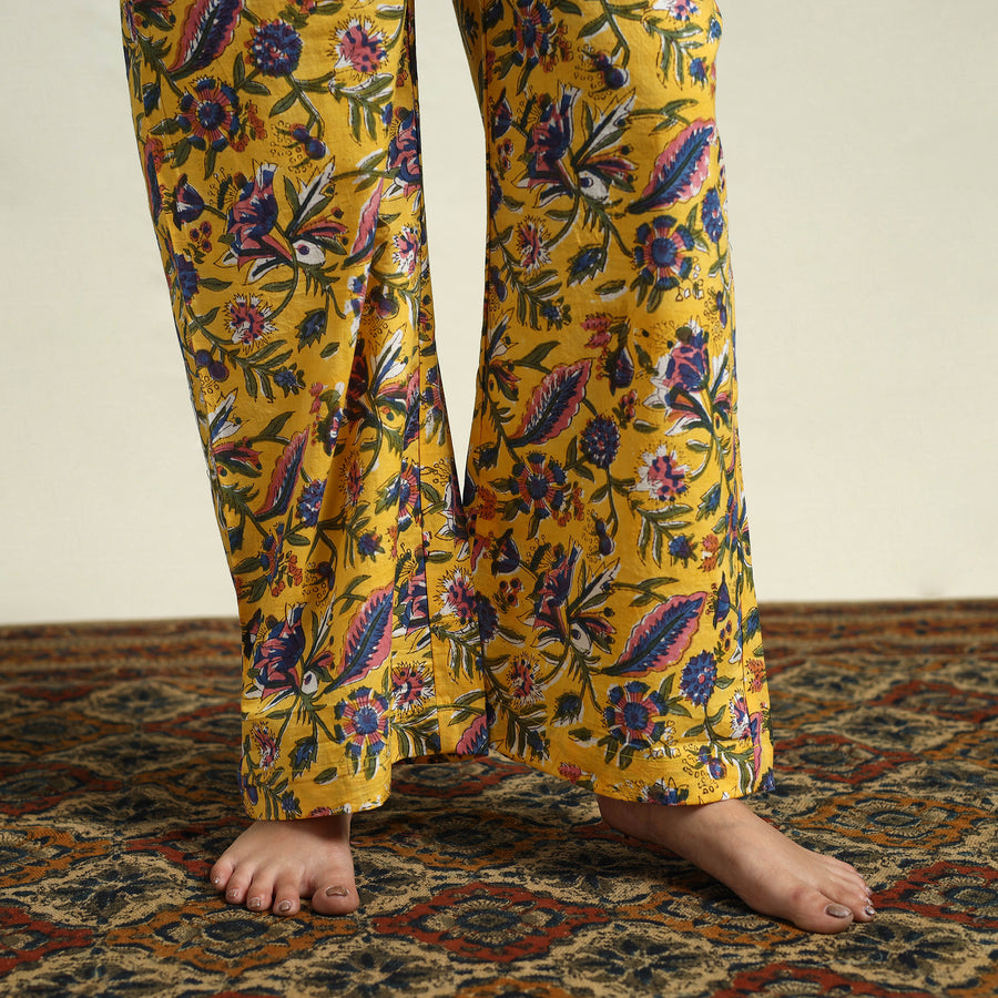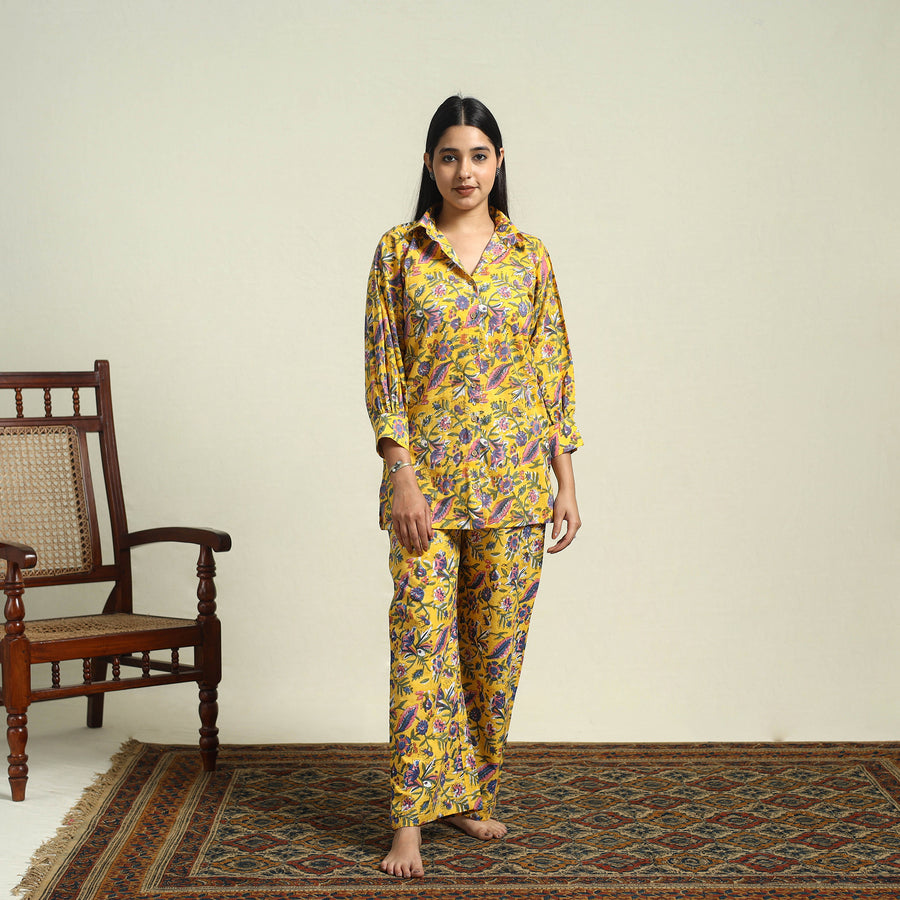 Sleep in comfort and style with this yellow sanganeri night suit set, adorned with traditional floral hand block prints. Crafted from breathable cotton, the set includes a relaxed-fit top and matching pyjamas with an elasticated waist and two side pockets for added ease. Originating from Rajasthan, sanganeri block printing is a centuries old craft known for its delicate patterns and vibrant charm.