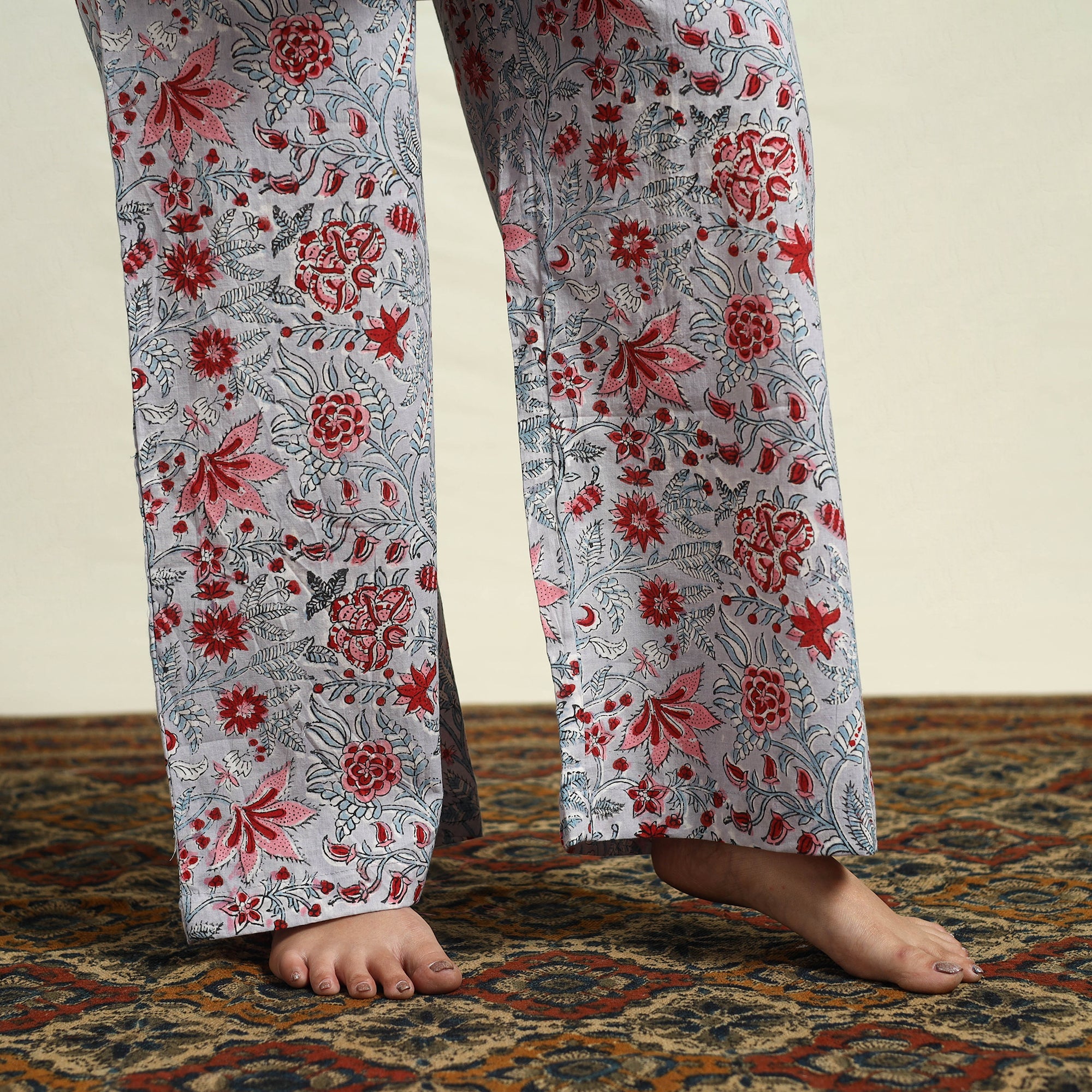 Sleep in comfort and style with this grey sanganeri night suit set, adorned with traditional floral hand block prints. Crafted from breathable cotton, the set includes a relaxed-fit top and matching pyjamas with an elasticated waist and two side pockets for added ease. Originating from Rajasthan, sanganeri block printing is a centuries old craft known for its delicate patterns and vibrant charm.