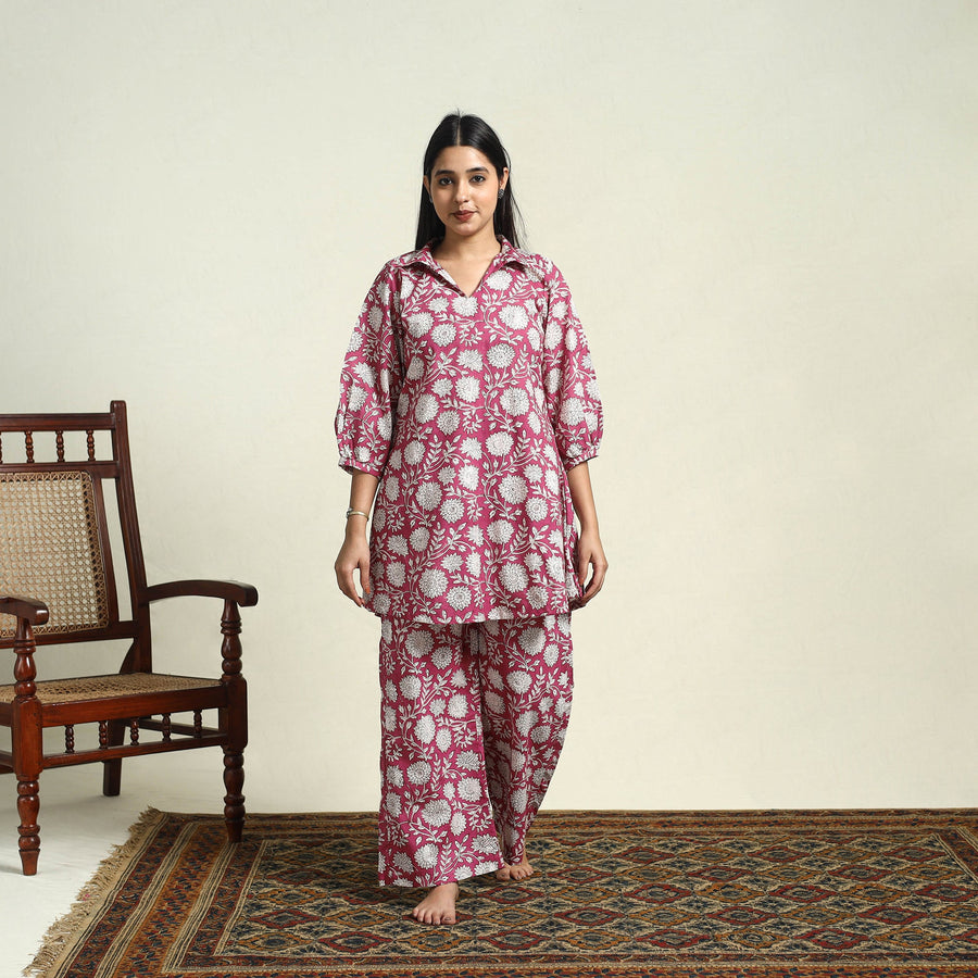 Sleep in comfort and style with this pink sanganeri night suit set, adorned with traditional floral hand block prints. Crafted from breathable cotton, the set includes a relaxed-fit top and matching pyjamas with an elasticated waist and two side pockets for added ease. Originating from Rajasthan, sanganeri block printing is a centuries old craft known for its delicate patterns and vibrant charm.