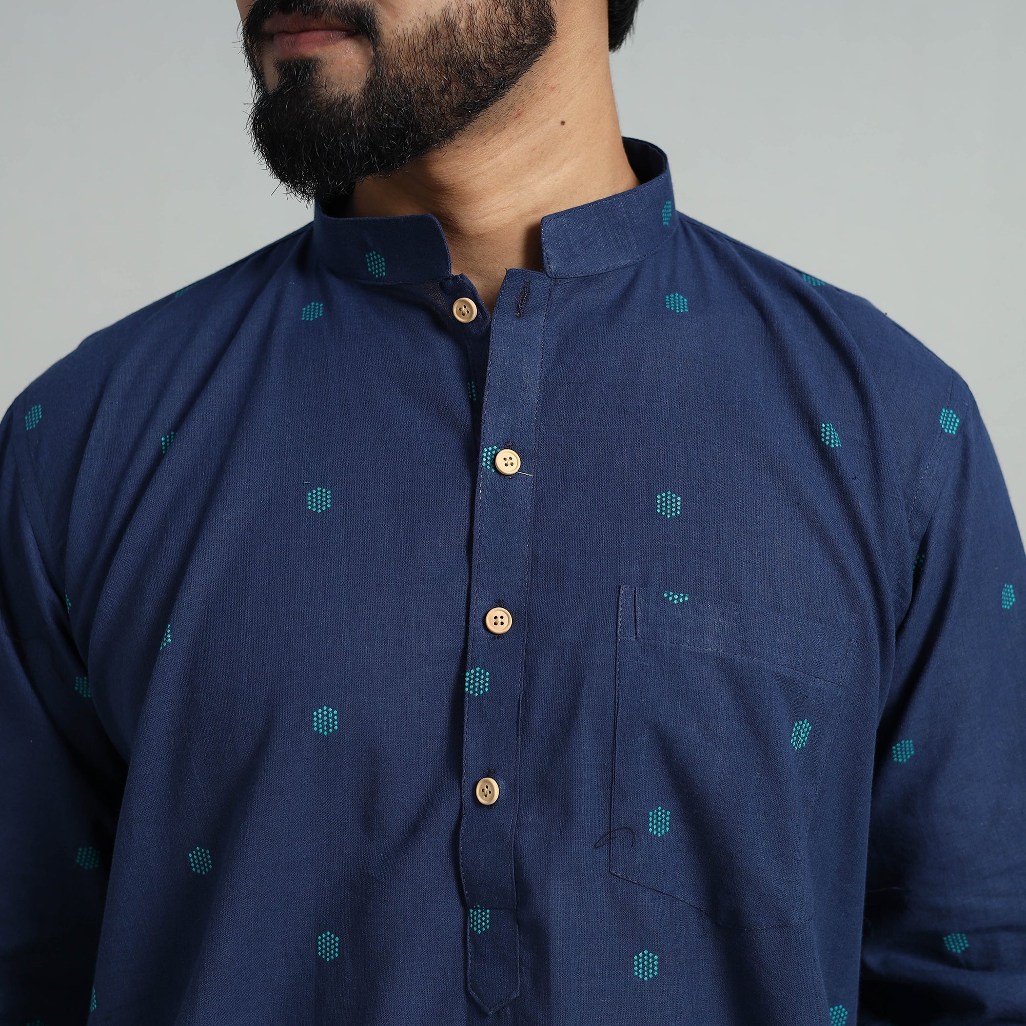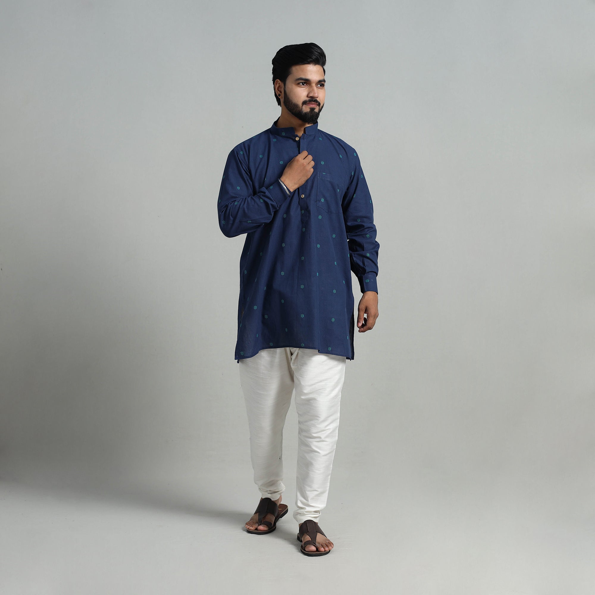 Step into elegance with cotton short jacquard kurta for men, a perfect blend of tradition and style. Handcrafted from jacquard fabric, this short kurta features full sleeves, a front button placket, and a chinese collar for a modern touch. With functional side pockets, it’s designed for comfort and practicality. Ideal for festive occasions or casual wear, this kurta celebrates India’s artisanal heritage.