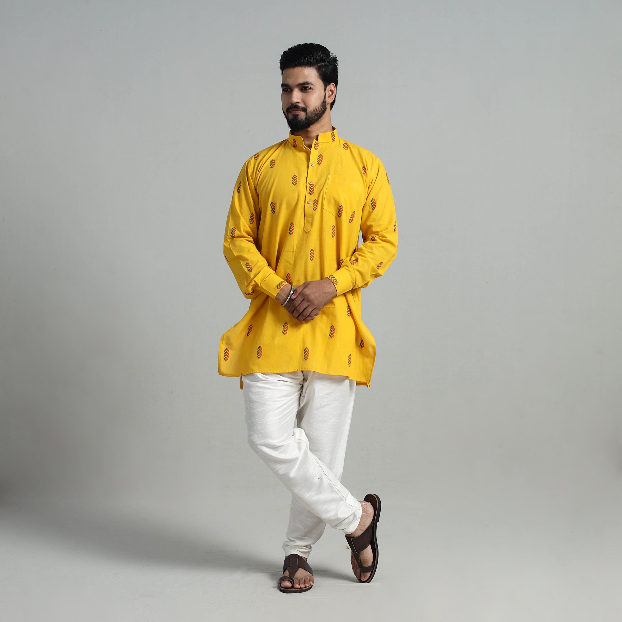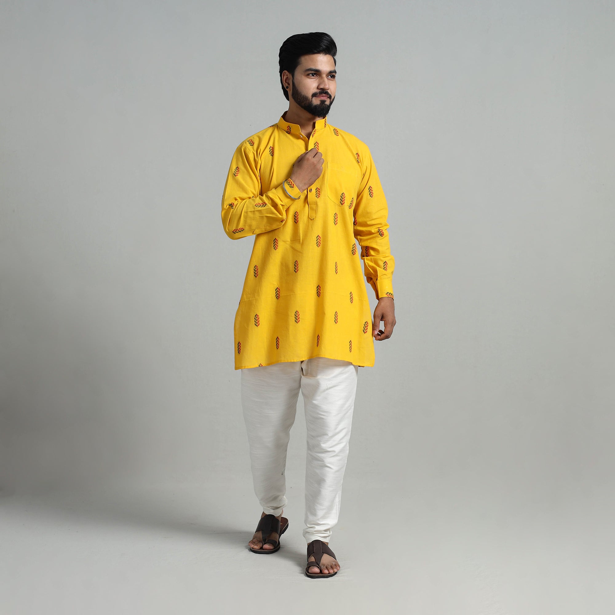 Step into elegance with cotton short jacquard kurta for men, a perfect blend of tradition and style. Handcrafted from jacquard fabric, this short kurta features full sleeves, a front button placket, and a chinese collar for a modern touch. With functional side pockets, it’s designed for comfort and practicality. Ideal for festive occasions or casual wear, this kurta celebrates India’s artisanal heritage.