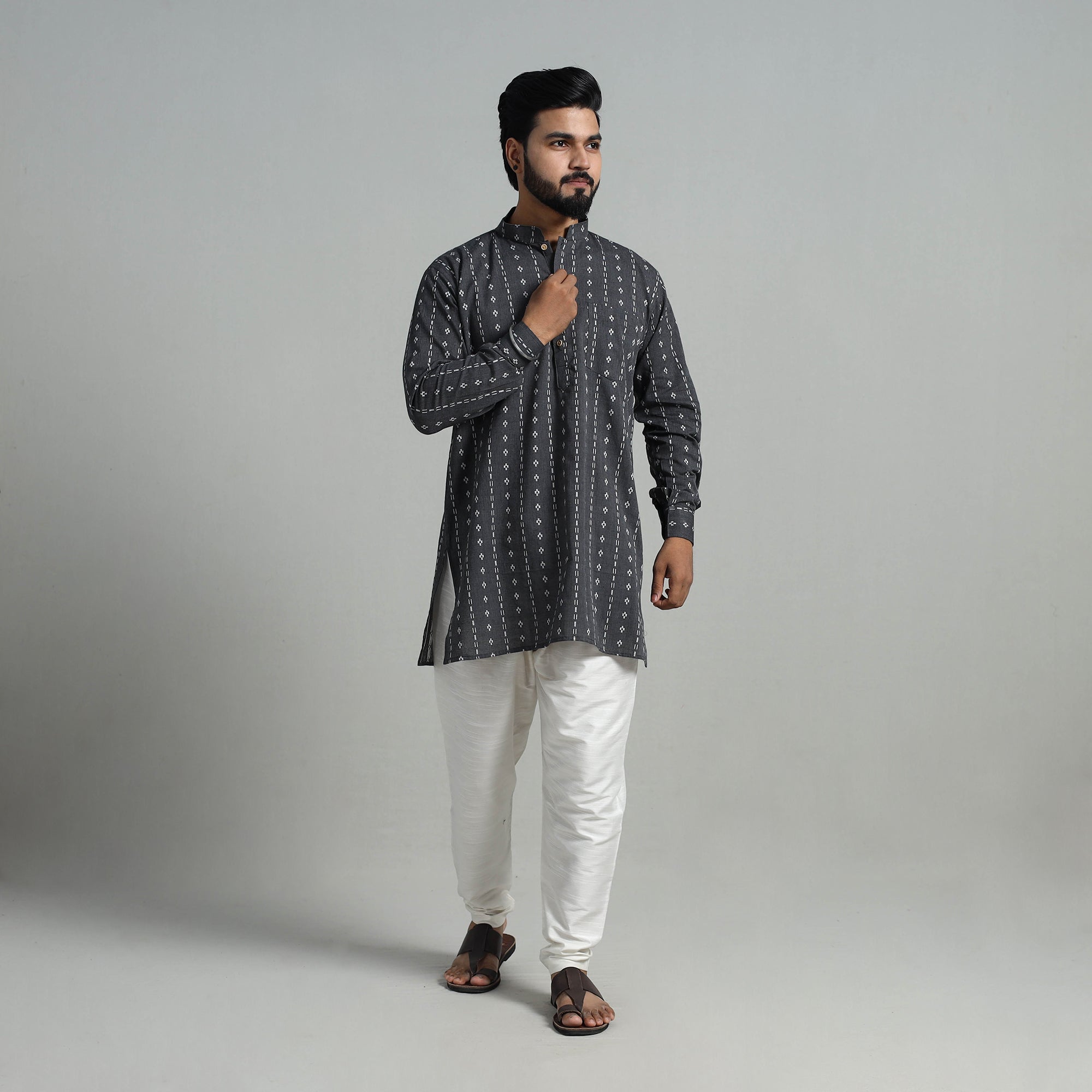 Step into elegance with cotton short jacquard kurta for men, a perfect blend of tradition and style. Handcrafted from jacquard fabric, this short kurta features full sleeves, a front button placket, and a chinese collar for a modern touch. With functional side pockets, it’s designed for comfort and practicality. Ideal for festive occasions or casual wear, this kurta celebrates India’s artisanal heritage. This piece carries tiny knots, thread pulls, or uneven lines — not flaws, but fingerprints. Every irregularity is a whisper from the hands that made it. It’s what happens when tradition weaves through time, not machines. If you’re looking for perfection, this isn’t it. But if you’re looking for soul — you’ve found it.