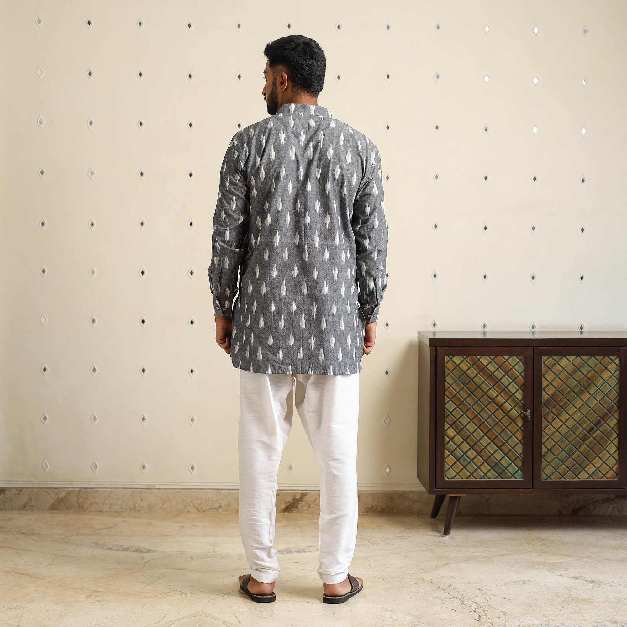 This traditional grey pochampally Ikat cotton kurta for men, woven in Telangana’s features a classic pattern created using a resist-dyeing technique on the yarns before weaving. It comes with full sleeves, a Chinese collar, front pocket, and front button placket. Comfortable to wear and smart in look, ideal for daily wear or special gatherings.