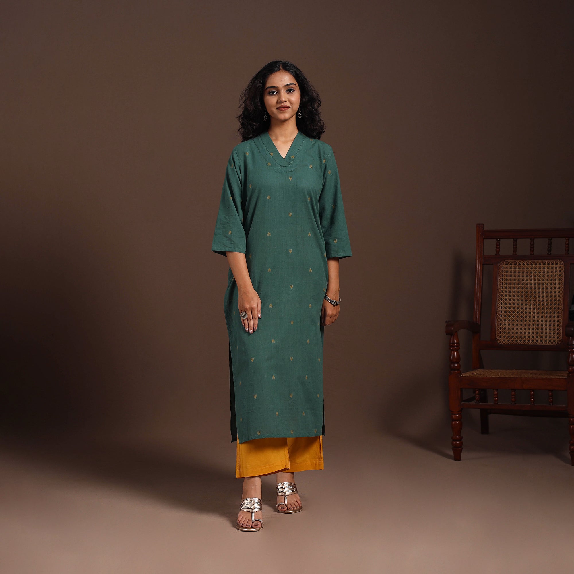 Elevate your everyday look with this green cotton straight jacquard kurta. The jacquard weave elegant patterns directly into the fabric, adding a soft texture that you can both see and feel. Its breathable cotton keeps you comfortable even during long workdays. Designed with a convenient side pocket for your essentials, this kurta is perfect for casual lunches or catching up with friends.