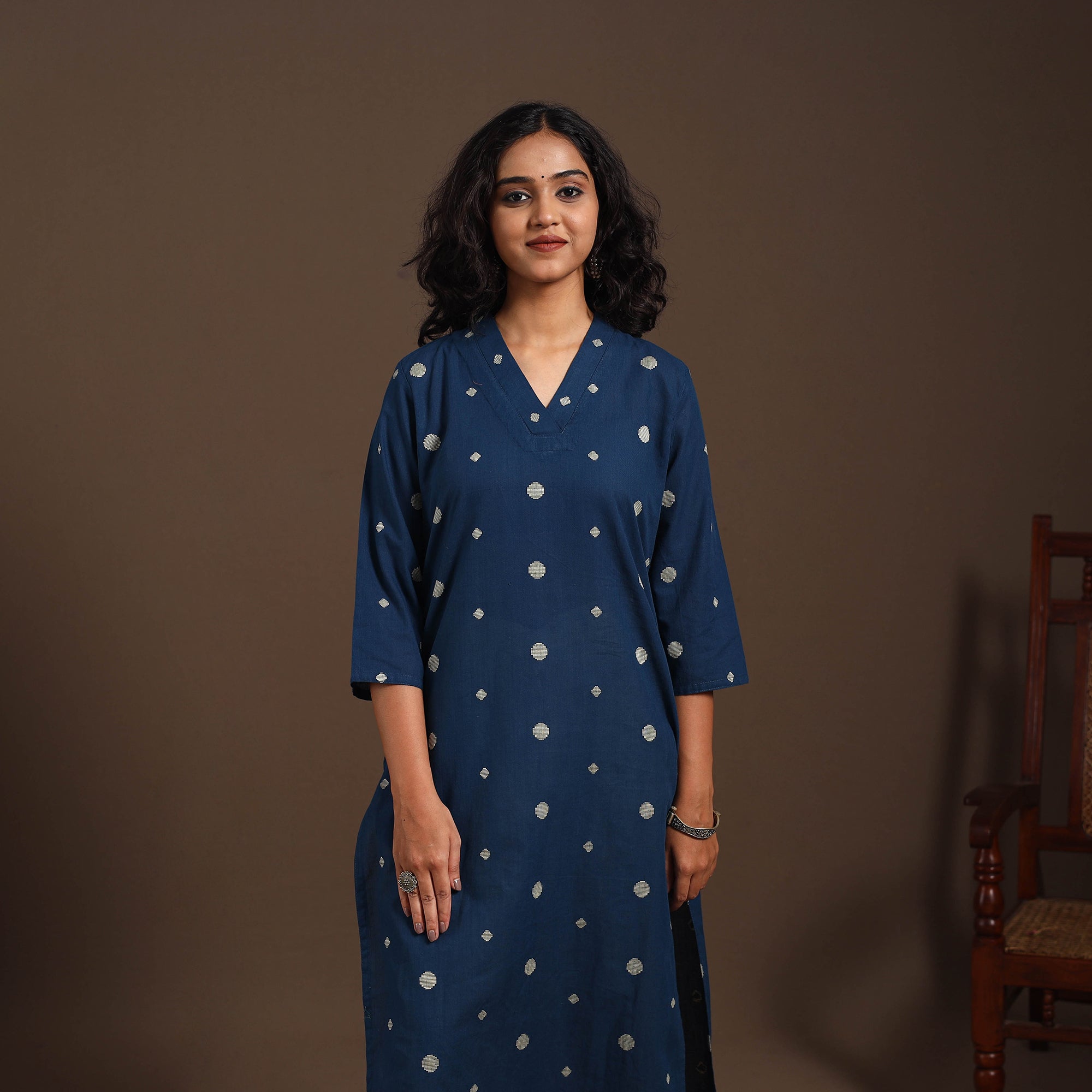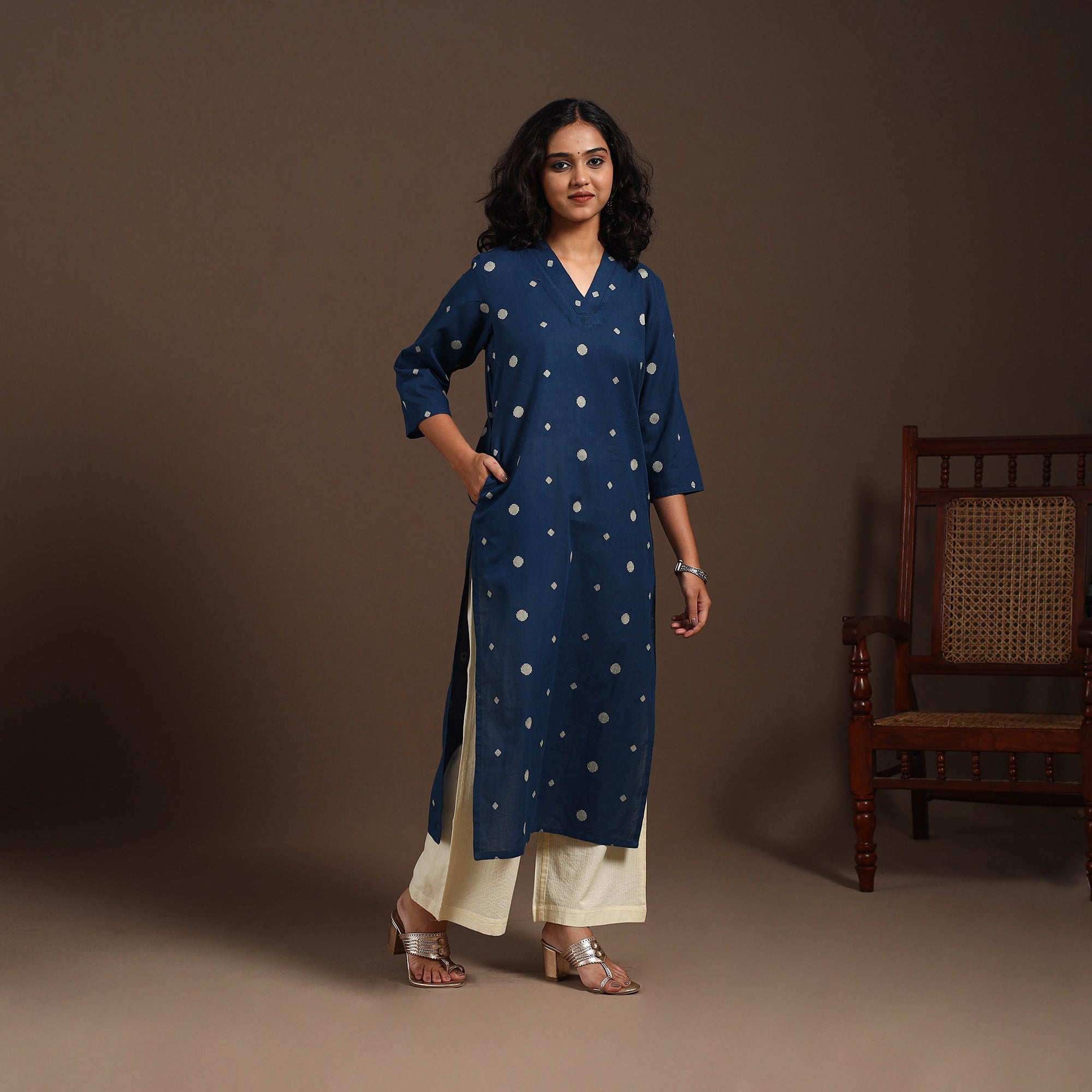 Elevate your everyday look with this blue cotton straight jacquard kurta. The jacquard weave elegant patterns directly into the fabric, adding a soft texture that you can both see and feel. Its breathable cotton keeps you comfortable even during long workdays. Designed with a convenient side pocket for your essentials, this kurta is perfect for casual lunches or catching up with friends.