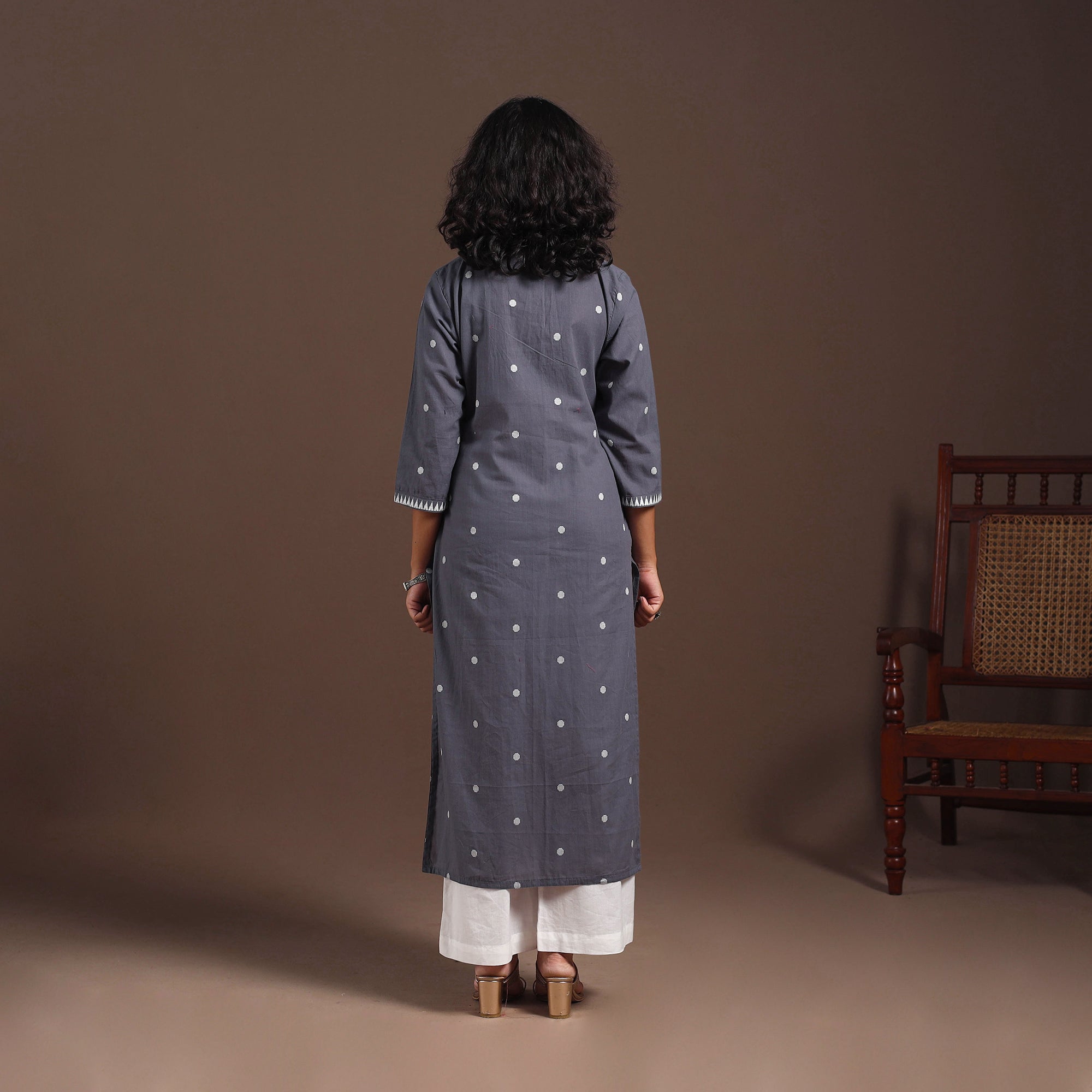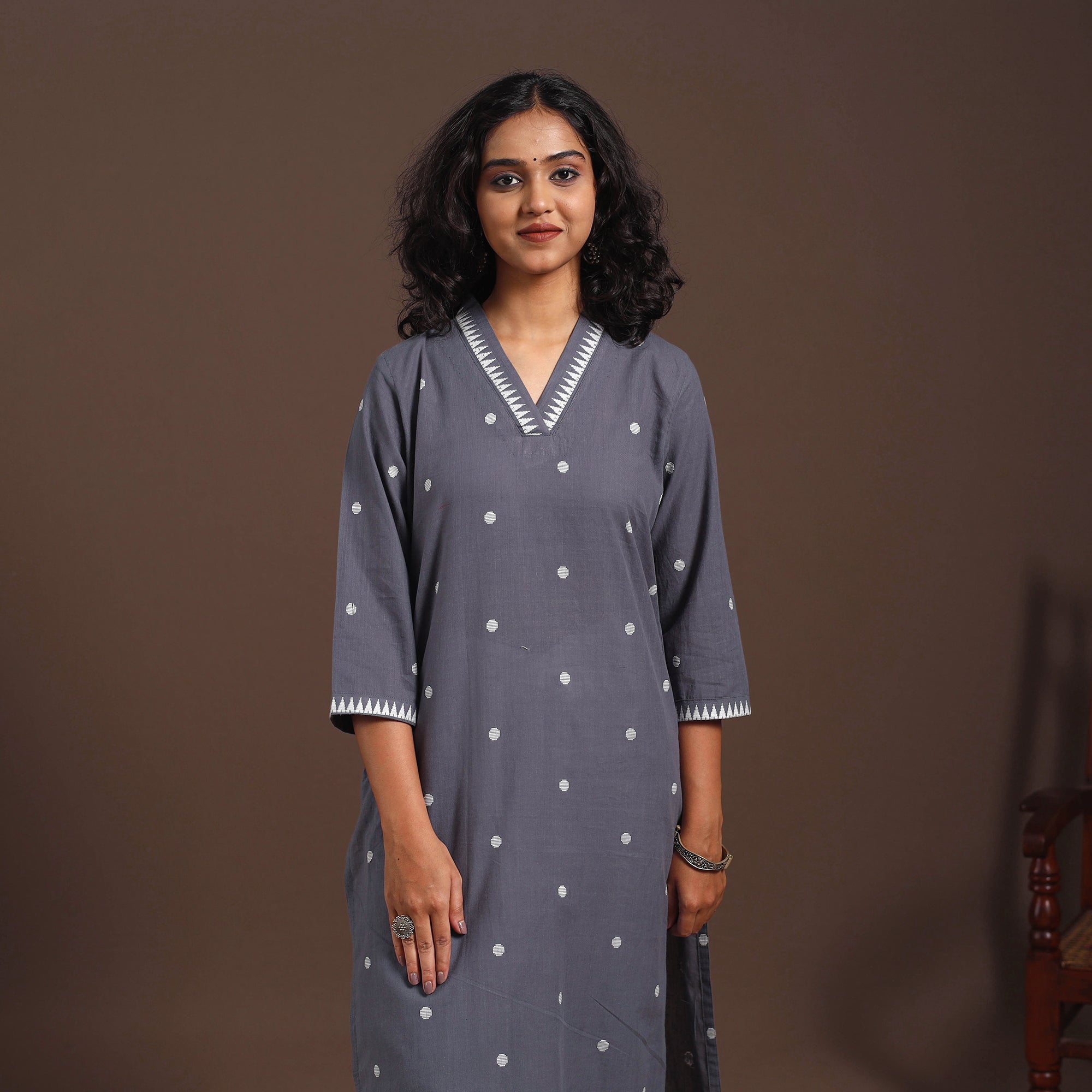 Elevate your everyday look with this grey cotton straight jacquard kurta. The jacquard weave elegant patterns directly into the fabric, adding a soft texture that you can both see and feel. Its breathable cotton keeps you comfortable even during long workdays. Designed with a convenient side pocket for your essentials, this kurta is perfect for casual lunches or catching up with friends.