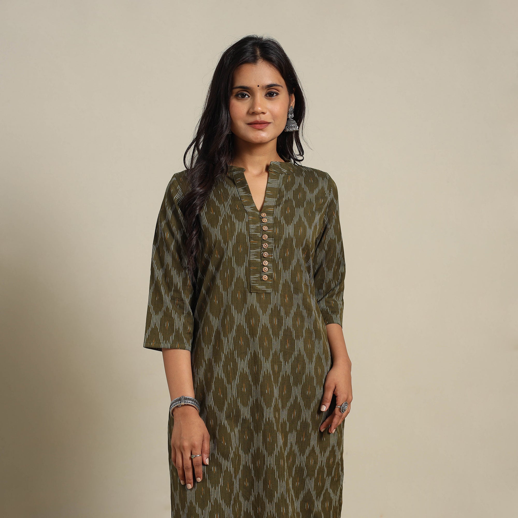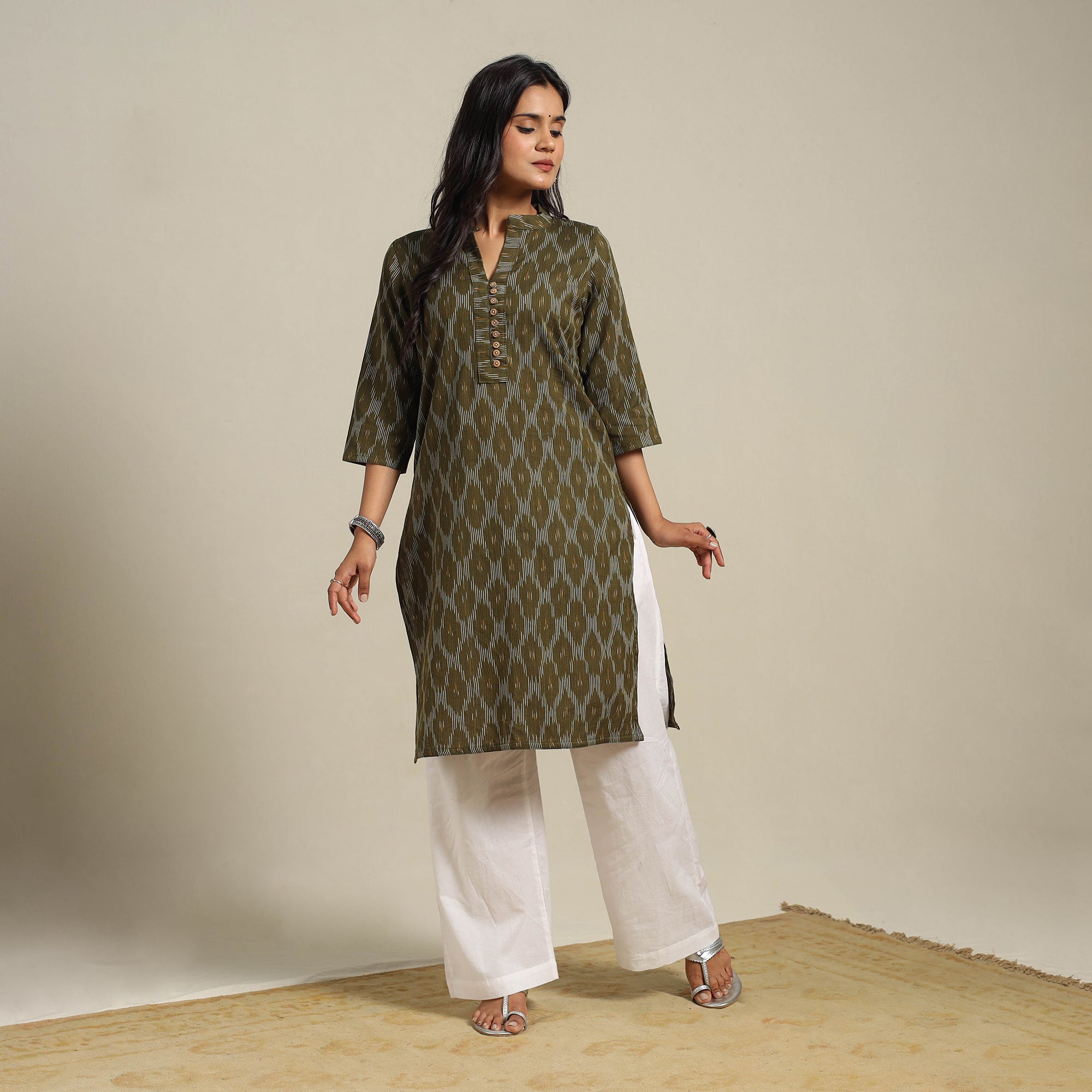 This green cotton straight pochampally Ikat kurta is crafted using the age-old resist-dye technique. The intricate patterns are created by dyeing the yarns before weaving, resulting in a rich, woven design. Thoughtfully designed with a handy side pocket perfect for keeping small essentials, it’s ideal for workdays, casual brunches, relaxed weekends, or even light festive gatherings.