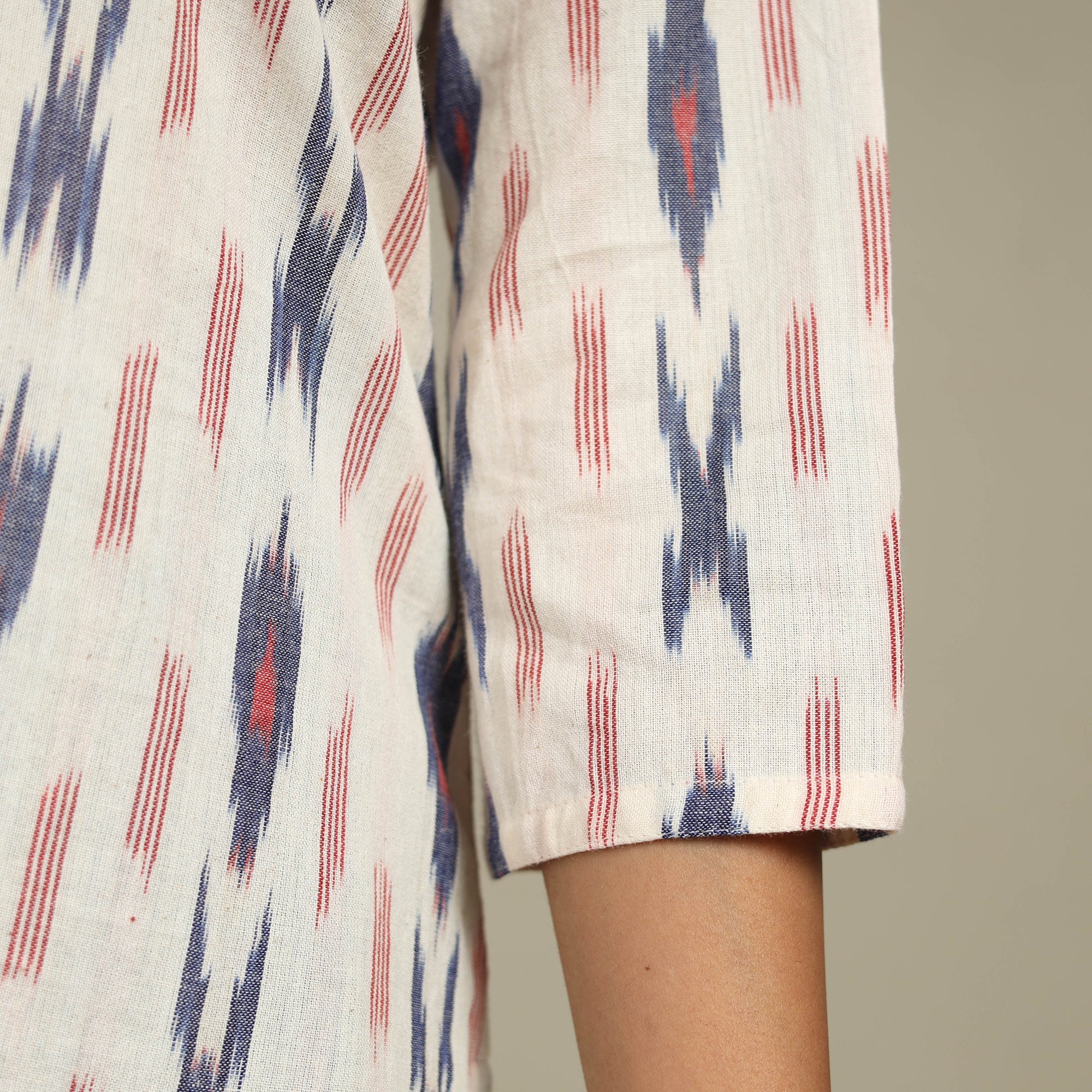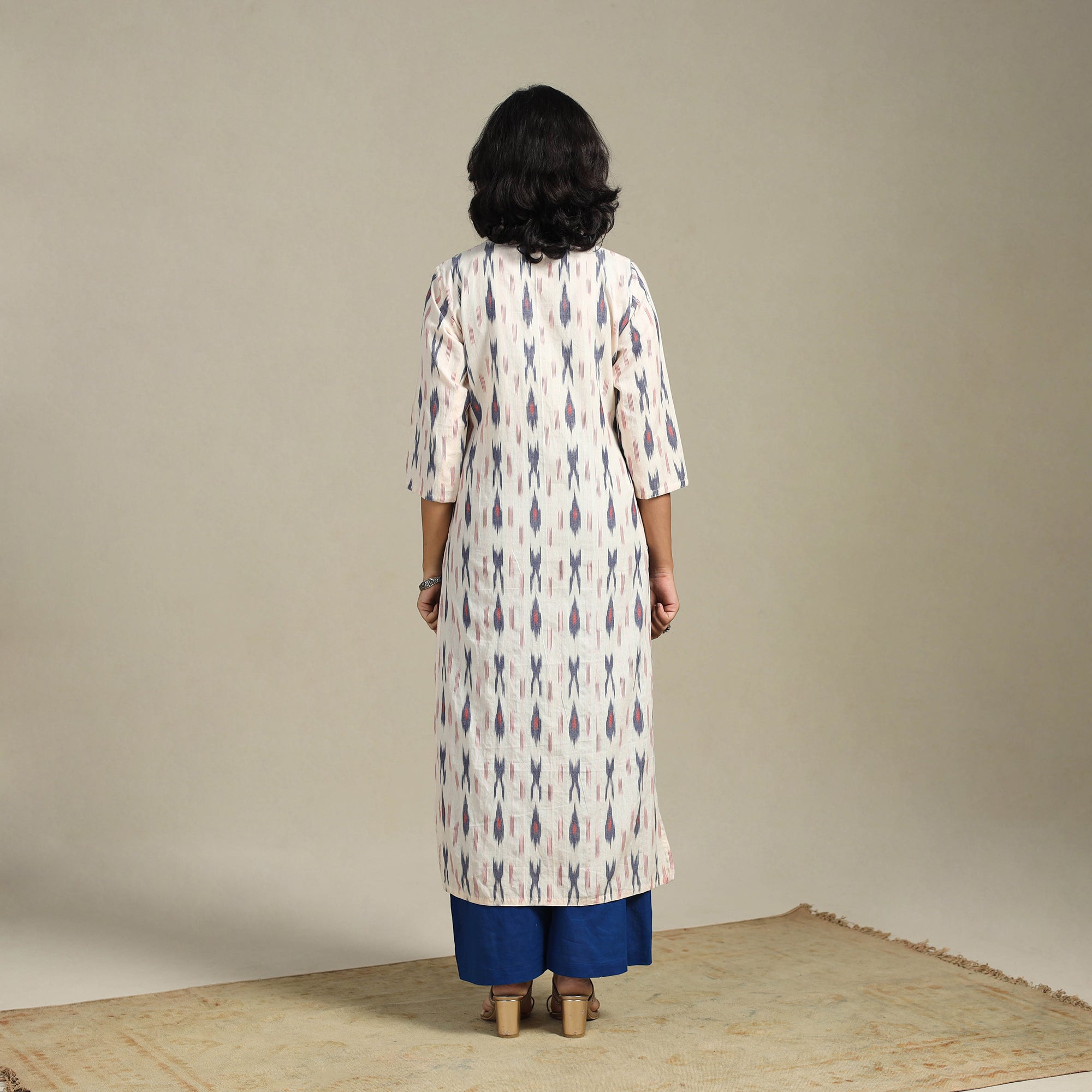 This white cotton straight pochampally Ikat kurta is crafted using the resist dye technique, where yarns are dyed before weaving to create intricate patterns. It includes a side pocket, perfect for carrying your phone or keys. Comfortable for office wear, and ideal for casual outings, relaxed weekends, or festive occasions.