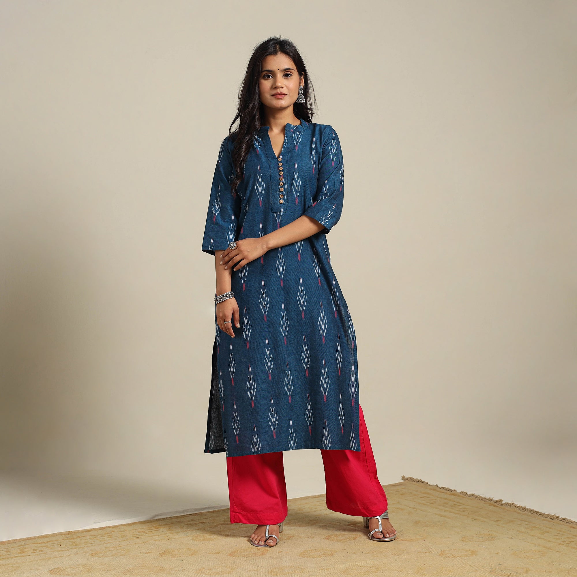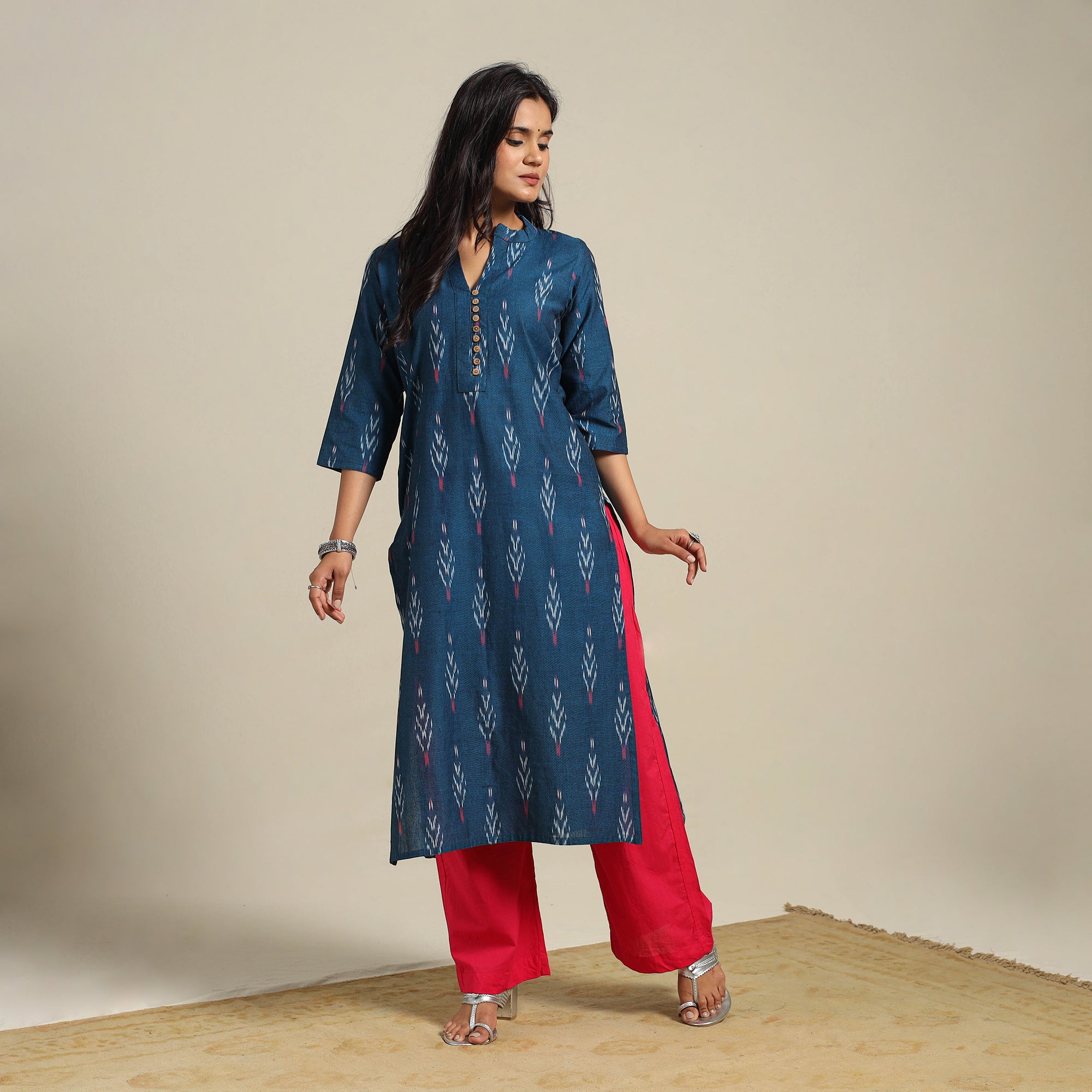 This blue cotton straight pochampally Ikat kurta is crafted using the age-old resist-dye technique. The intricate patterns are created by dyeing the yarns before weaving, resulting in a rich, woven design. Thoughtfully designed with a handy side pocket perfect for keeping small essentials, it’s ideal for workdays, casual brunches, relaxed weekends, or even light festive gatherings.