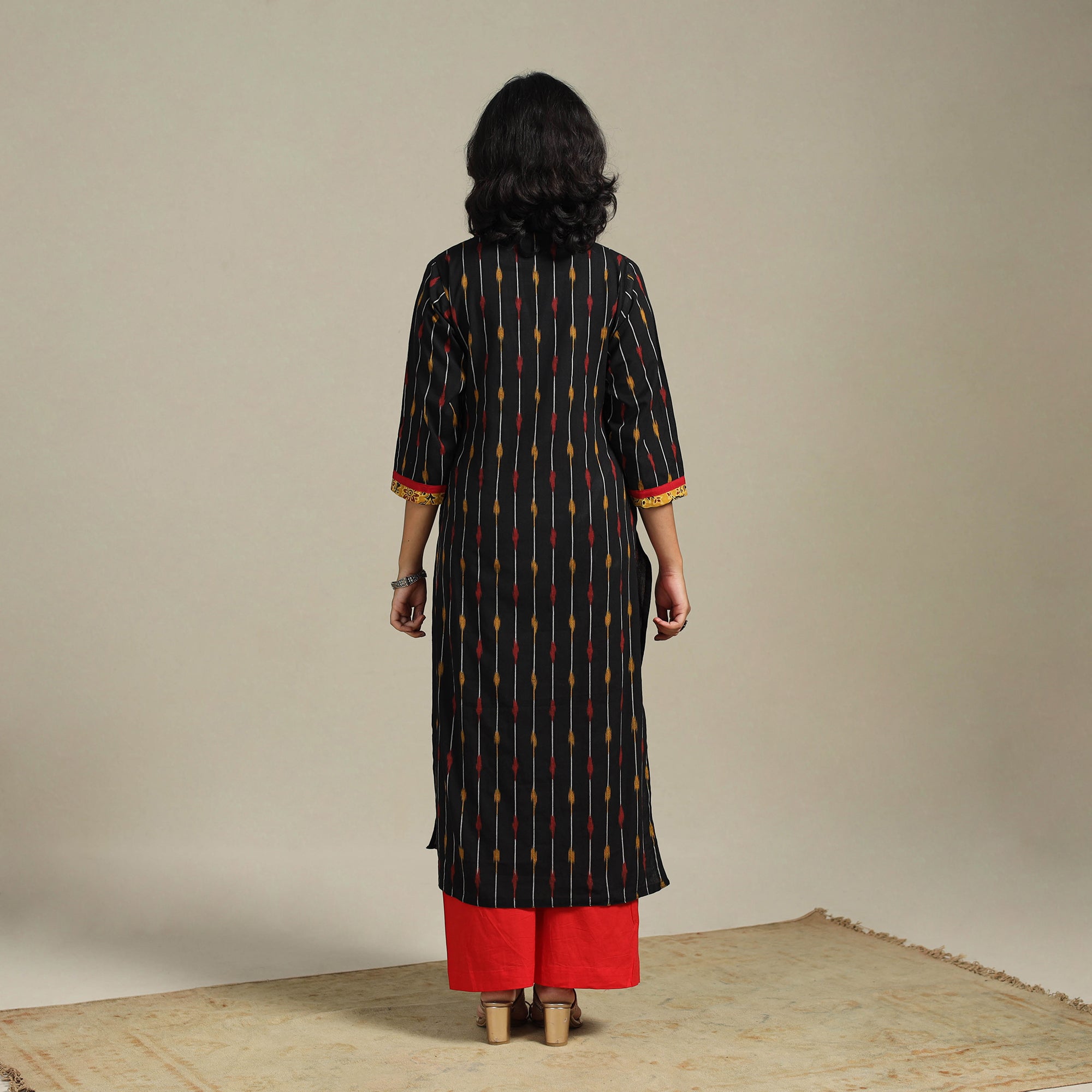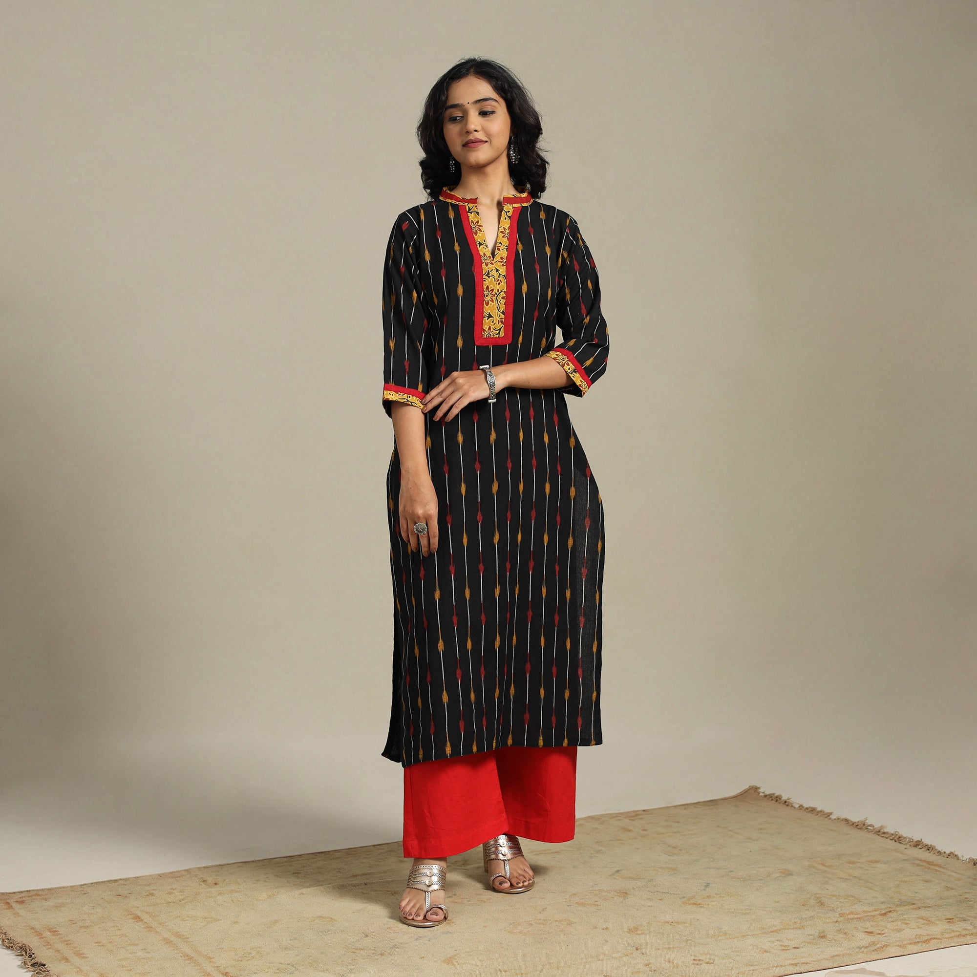 This black cotton straight pochampally Ikat kurta is crafted using the resist-dye technique, where yarns are dyed before weaving to form intricate patterns. The neckline features ajrakh block print detailing, adding a touch of traditional charm. It also includes a side pocket, perfect for carrying your phone or keys. Comfortable for office wear, and ideal for casual outings, relaxed weekends, or festive occasions.