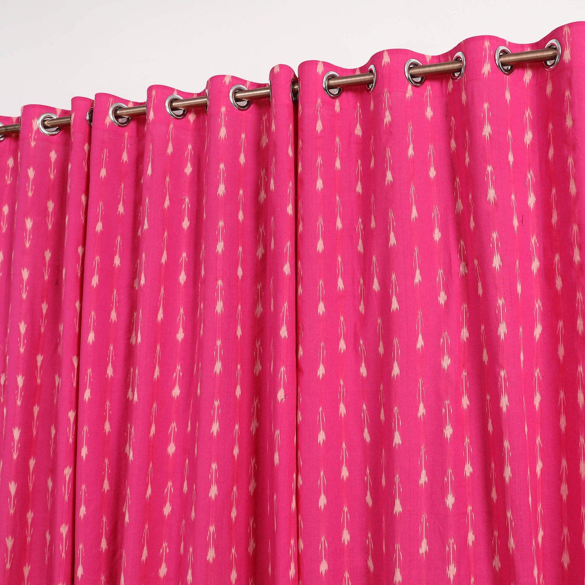 This pink pochampally ikat woven cotton window curtain adds an ethnic touch to any room, making it a perfect addition to your home decor collection. Originating from Telangana, the Ikat craft is renowned for its vibrant geometric patterns. Before weaving, the threads are carefully dyed to create these intricate designs. Indian Ikat is a fabric admired by fashion designers worldwide for its artistry and elegance.