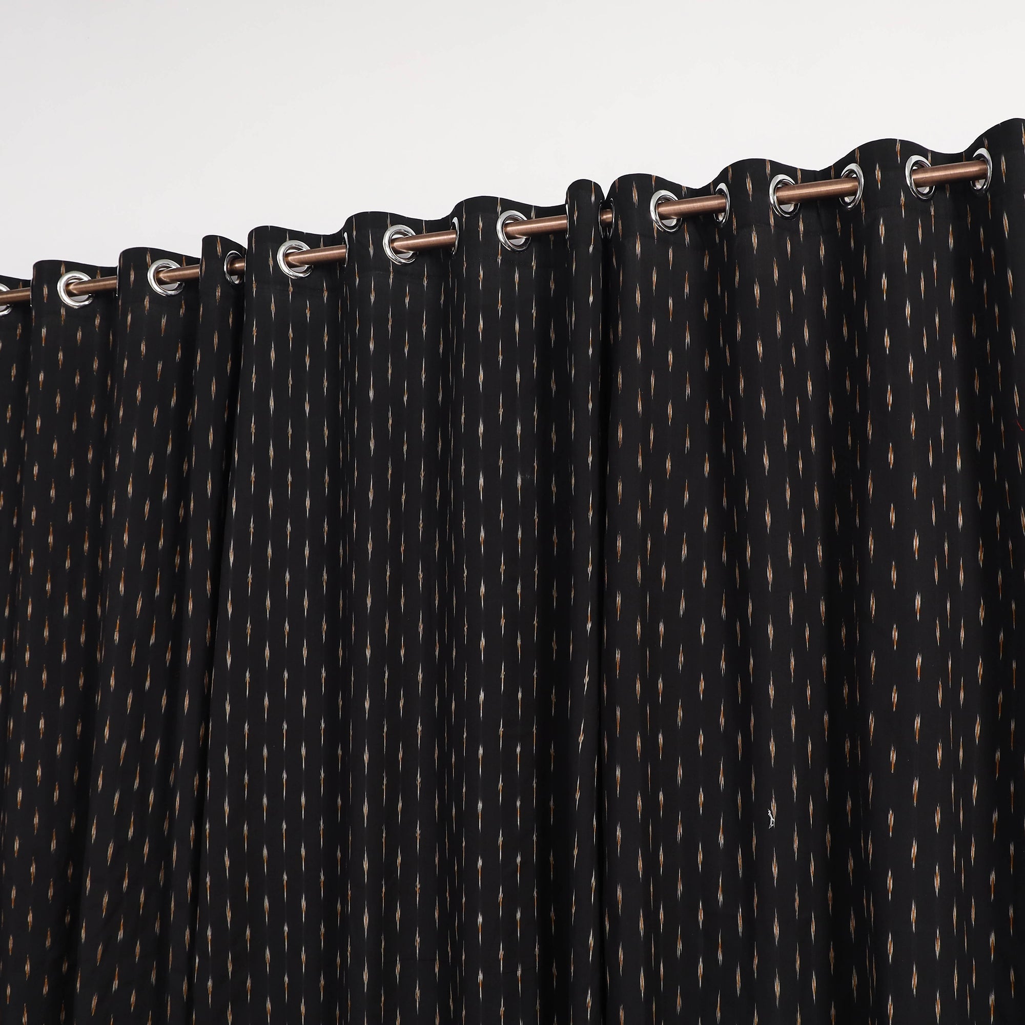 This black pochampally ikat woven cotton window curtain adds an ethnic touch to any room, making it a perfect addition to your home decor collection. Originating from Telangana, the Ikat craft is renowned for its vibrant geometric patterns. Before weaving, the threads are carefully dyed to create these intricate designs. Indian Ikat is a fabric admired by fashion designers worldwide for its artistry and elegance.