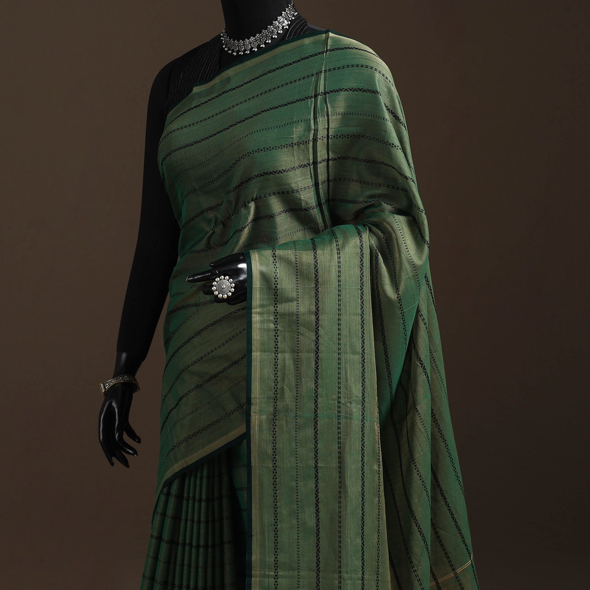 Green dharwad cotton saree from Karnataka is woven using a traditional method known for its firm texture. The saree features fine thread stripes, where small motifs are woven directly into the fabric using extra threads. These simple yet graceful details make the saree perfect for both formal occasions and festive celebrations.