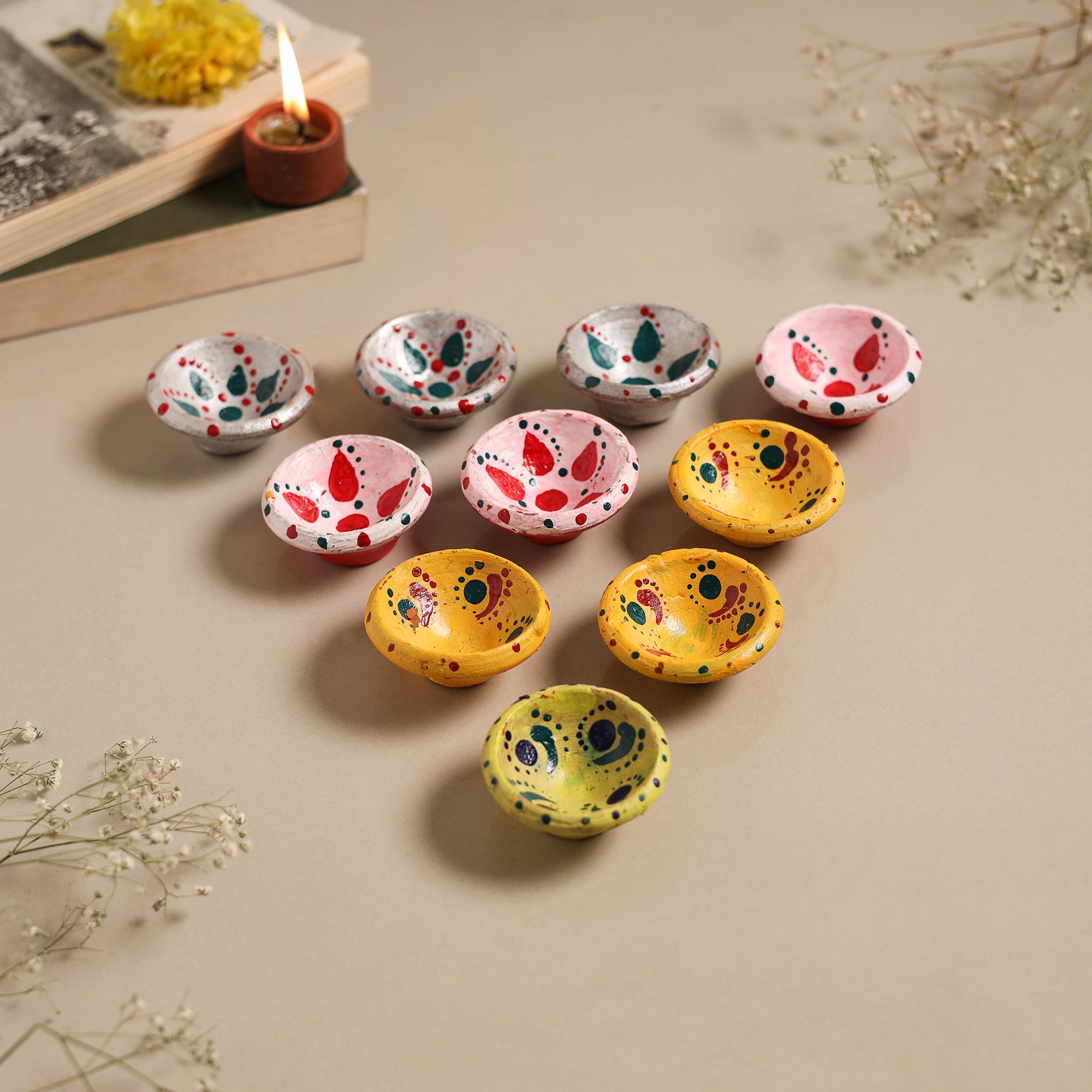 This decorative hand-painted clay diya set brings festive sparkle and elegance to any space. Designed in vibrant hues, each diya is ideal for puja rituals and home décor. Place them at the entrance, temple, or living area to create a graceful ambience and warm glow, making every celebration brighter and more memorable.