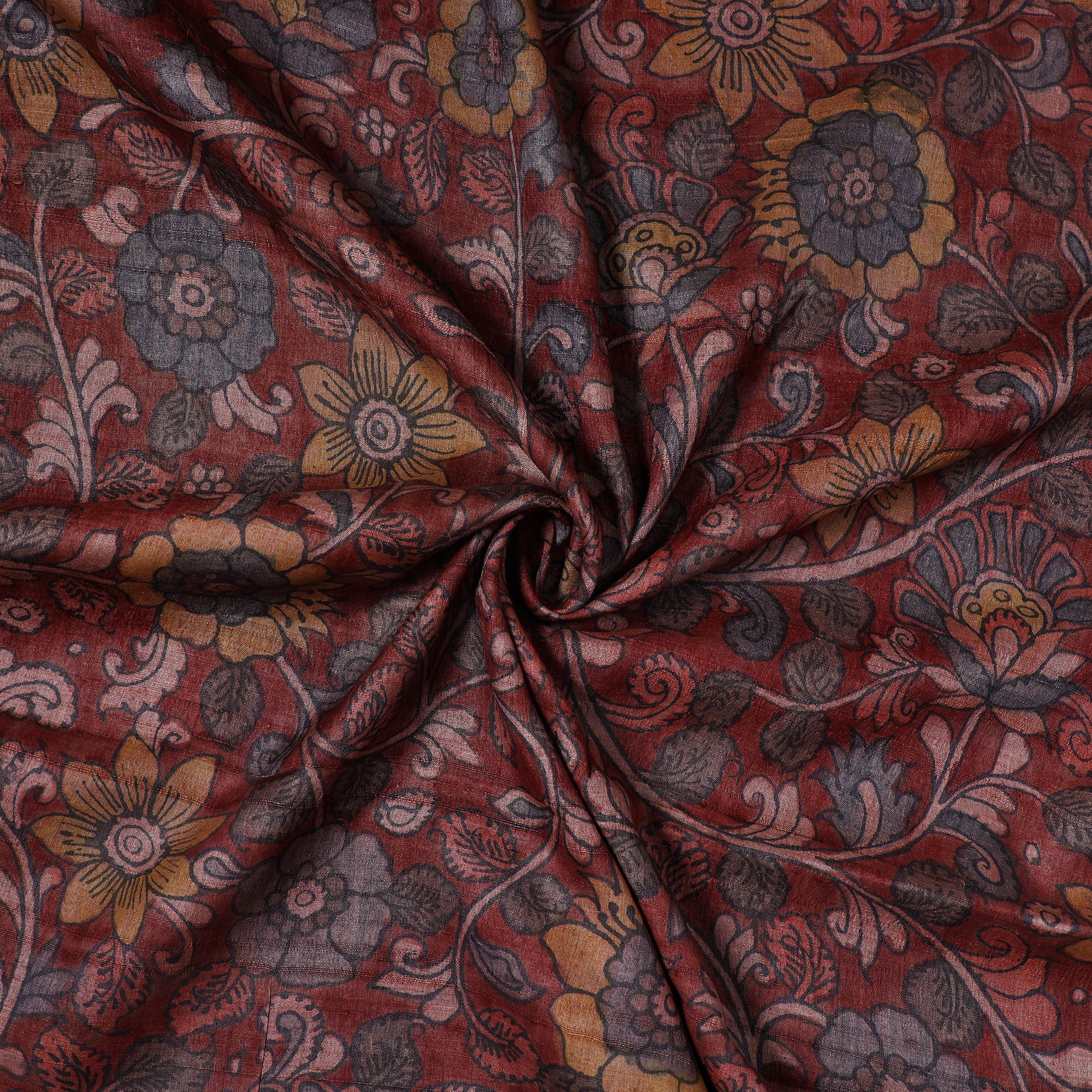 100% red handloom pure desi tussar silk fabric showcases the intricate srikalahasti style of Kalamkari pen work. Known for its gossamer texture and elegant feel, it is entirely handpainted using natural colors. The Srikalahasti style involves freehand drawing with a kalam (pen) and filling in rich hues a tradition practiced for over 200 years. Ideal for designing clothing, festive wear, or unique decor accents, this Kalamkari fabric carries a distinct natural odor. As it is hand-painted, slight color spread or irregularities in design are common and should not be considered as defects.