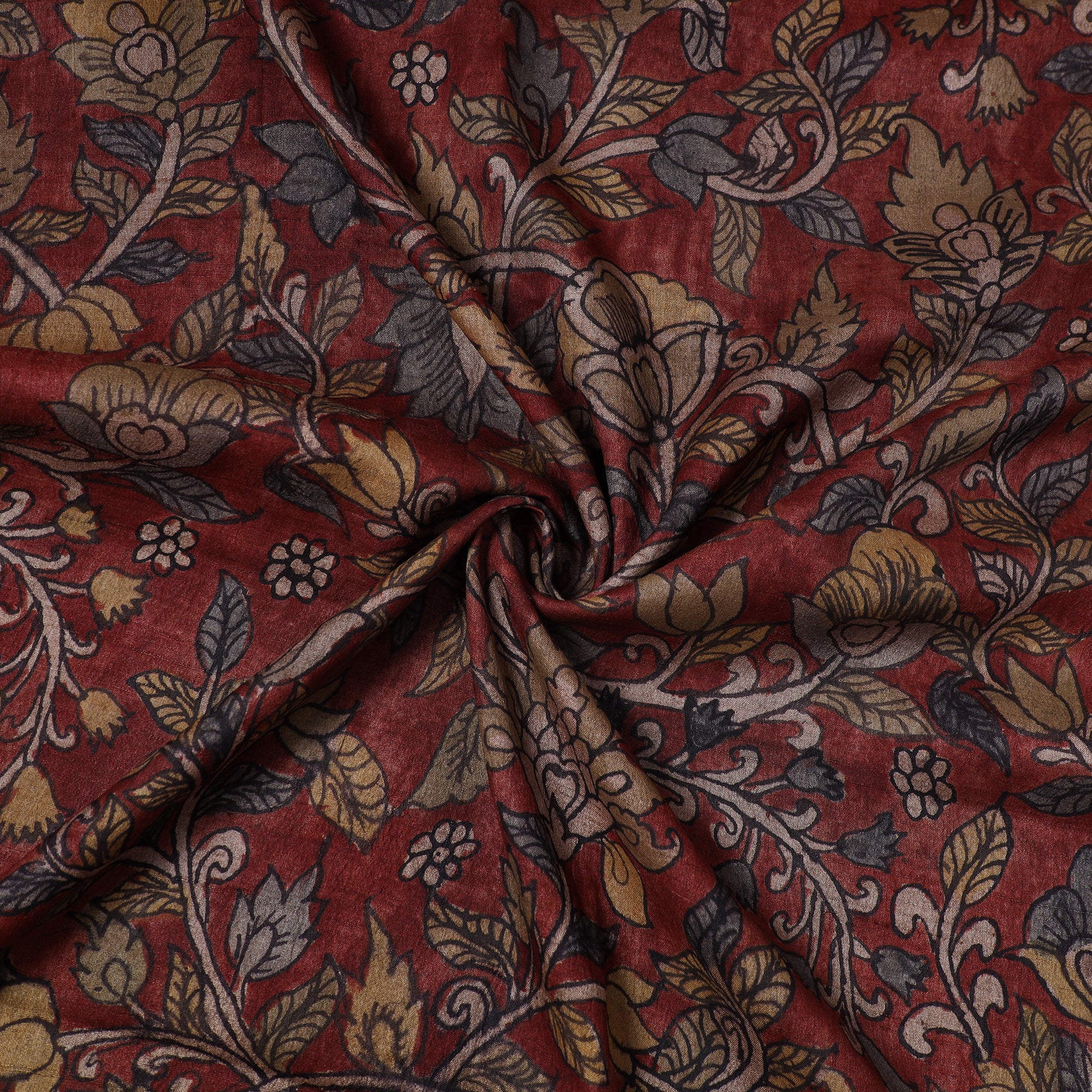 100% maroon handloom pure desi tussar silk fabric showcases the intricate srikalahasti style of Kalamkari pen work. Known for its gossamer texture and elegant feel, it is entirely handpainted using natural colors. The Srikalahasti style involves freehand drawing with a kalam (pen) and filling in rich hues a tradition practiced for over 200 years. Ideal for designing clothing, festive wear, or unique decor accents, this Kalamkari fabric carries a distinct natural odor. As it is hand-painted, slight color spread or irregularities in design are common and should not be considered as defects.