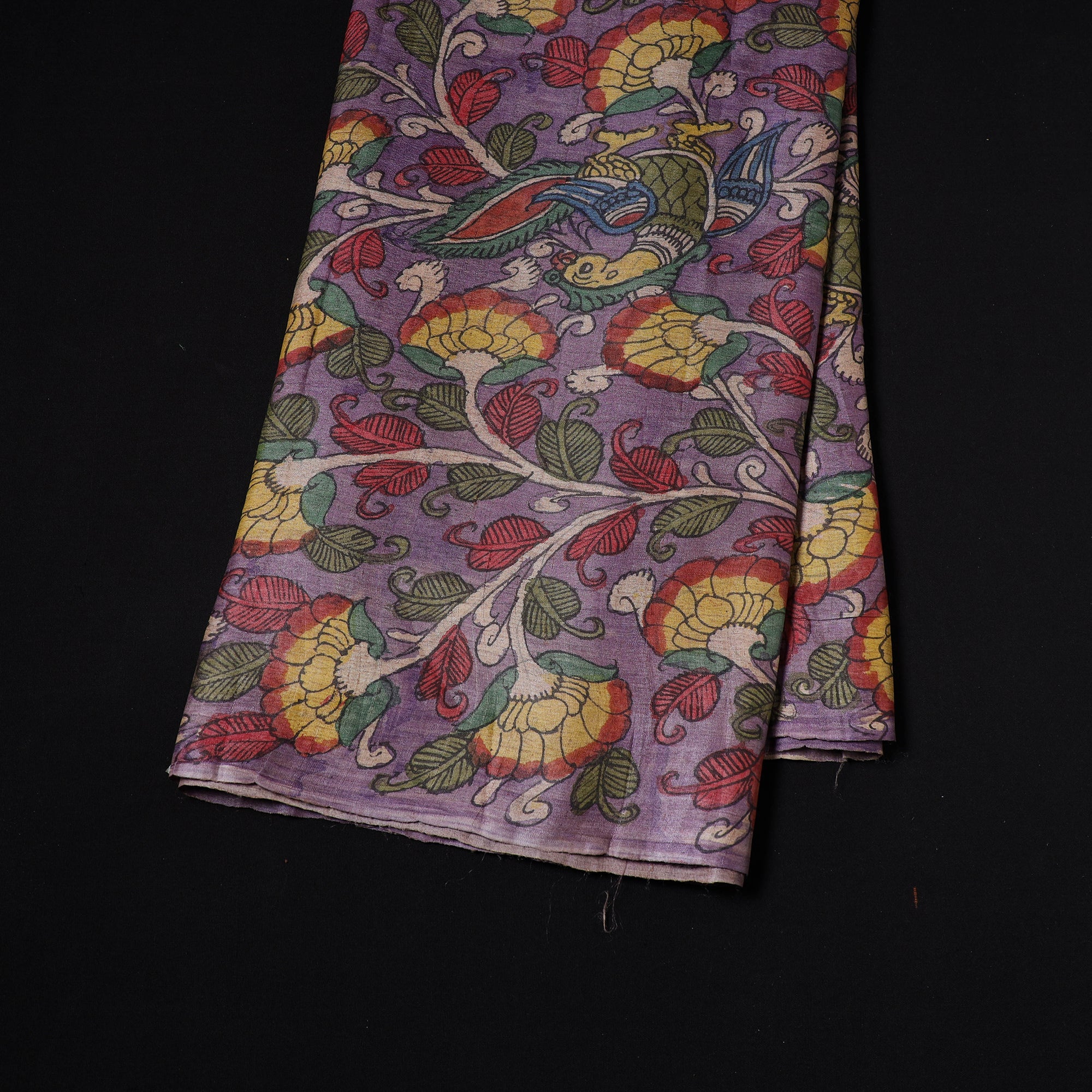 100% purple handloom pure desi tussar silk fabric showcases the intricate srikalahasti style of Kalamkari pen work. Known for its gossamer texture and elegant feel, it is entirely handpainted using natural colors. The Srikalahasti style involves freehand drawing with a kalam (pen) and filling in rich hues a tradition practiced for over 200 years. Ideal for designing clothing, festive wear, or unique decor accents, this Kalamkari fabric carries a distinct natural odor. As it is hand-painted, slight color spread or irregularities in design are common and should not be considered as defects.