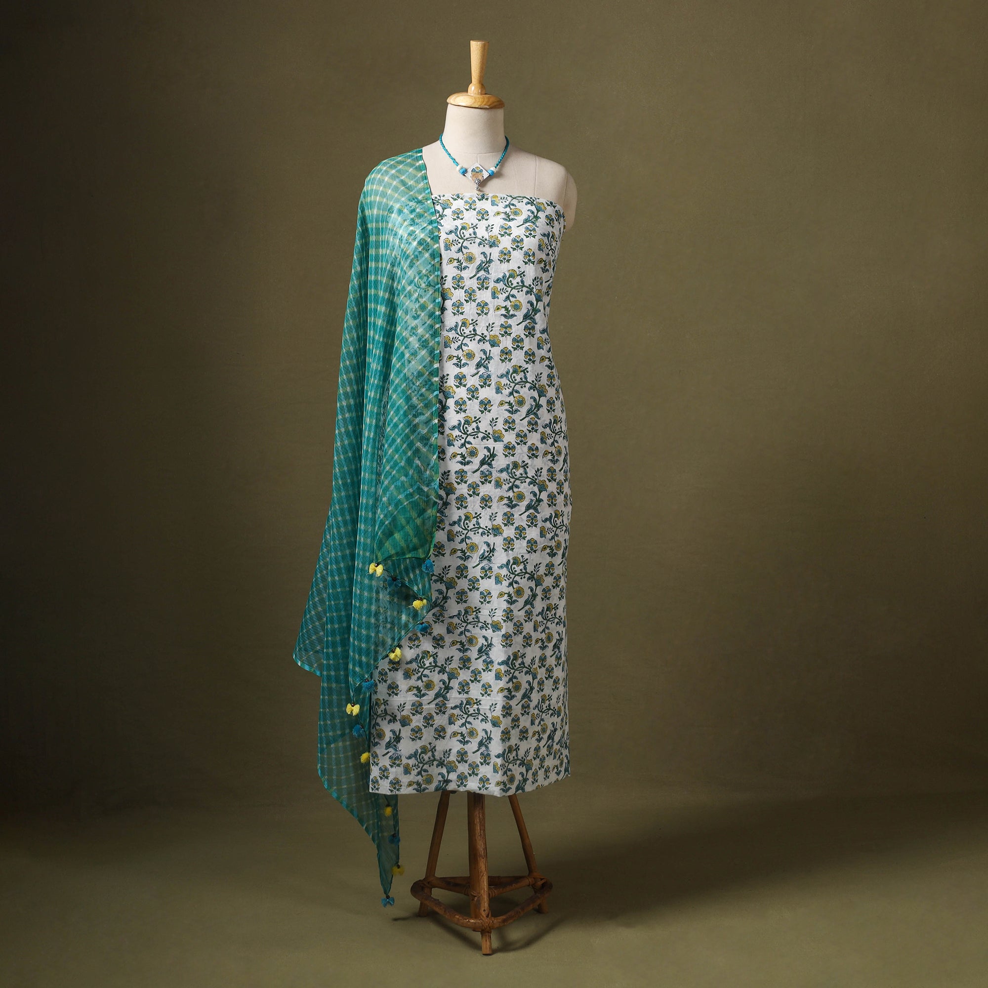 This 2pc green sanganeri cotton dress material set blends traditional artistry with everyday comfort. It includes a beautifully block-printed sanganeri kurta material and a breathable kota doria leheriya tie-dye dupatta, perfect for festive gatherings and special moments. To complete the look, the set comes with a handcrafted necklace and matching earrings that add a touch of elegance and artisanal charm.