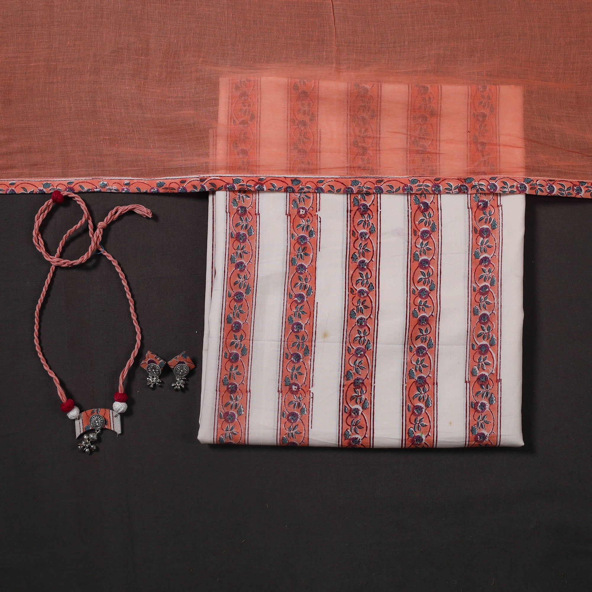 This 3pc peach sanganeri cotton dress material set beautifully blends tradition with comfort. It includes a finely block-printed sanganeri kurta fabric, a plain slub cotton bottom, and a soft, breathable cotton dupatta, perfect for festive gatherings and special moments. To add a special touch, the set also comes with a handcrafted necklace and matching earrings, lending an elegant and artisanal charm to your overall look.