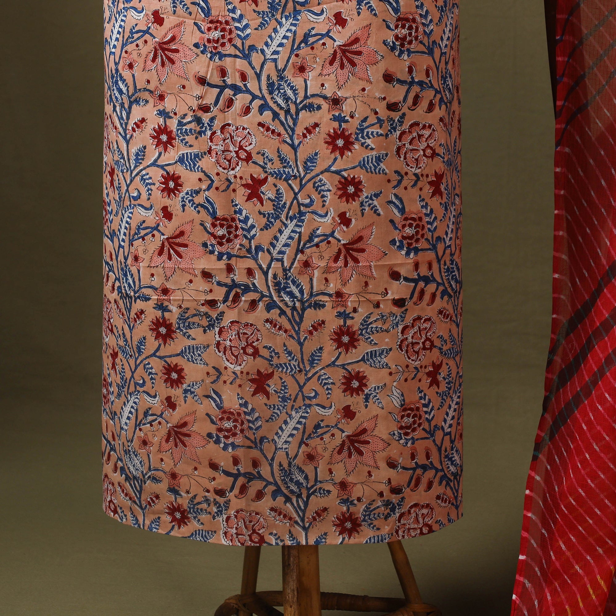 This 2pc peach sanganeri cotton dress material set blends traditional artistry with everyday comfort. It includes a beautifully block-printed sanganeri kurta material and a breathable kota doria leheriya tie-dye dupatta, perfect for festive gatherings and special moments. To complete the look, the set comes with a handcrafted necklace and matching earrings that add a touch of elegance and artisanal charm.