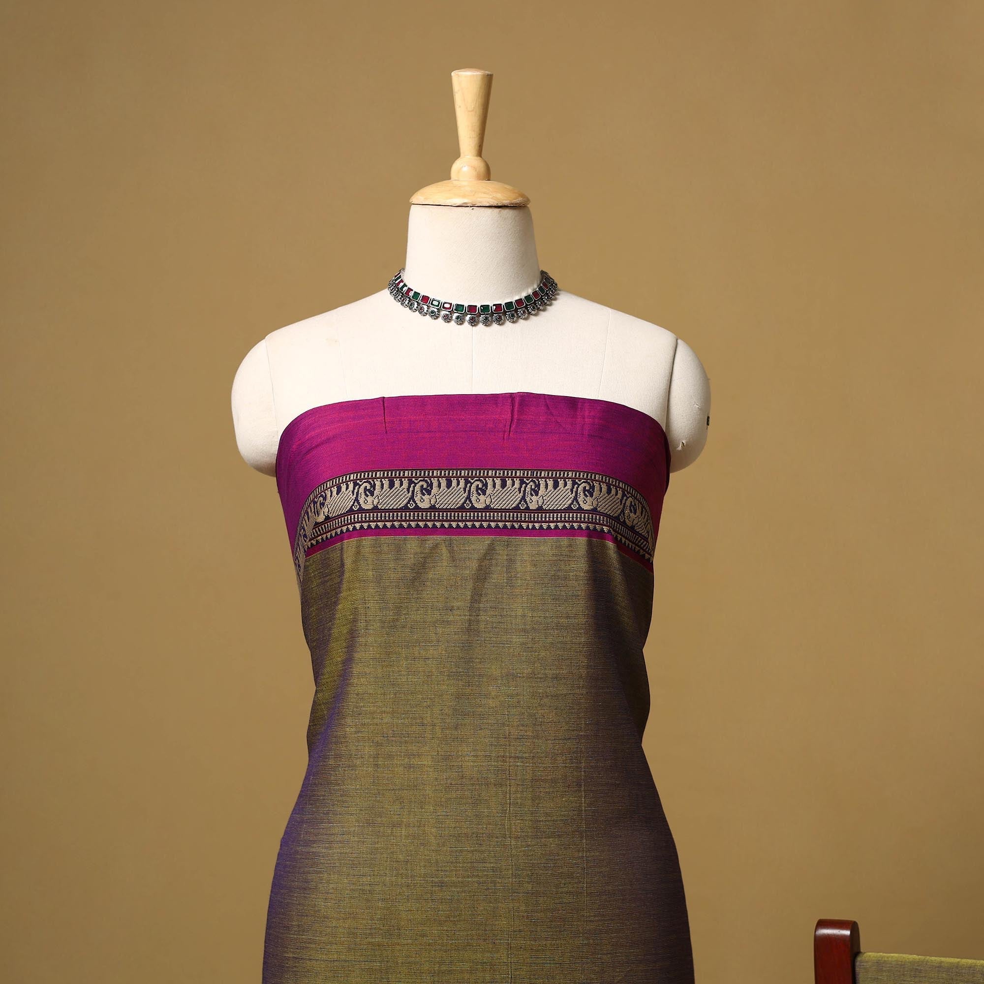 Dharwad cotton 3pc unstitched dress material from Karnataka is woven using a traditional method known for its firm texture and intricate border work. The border features fine motifs and patterns that reflect the region’s style. The set includes a beautifully crafted kurta piece, a matching bottom/salwar piece and a coordinating dupatta. Perfect for custom tailoring and everyday wear.