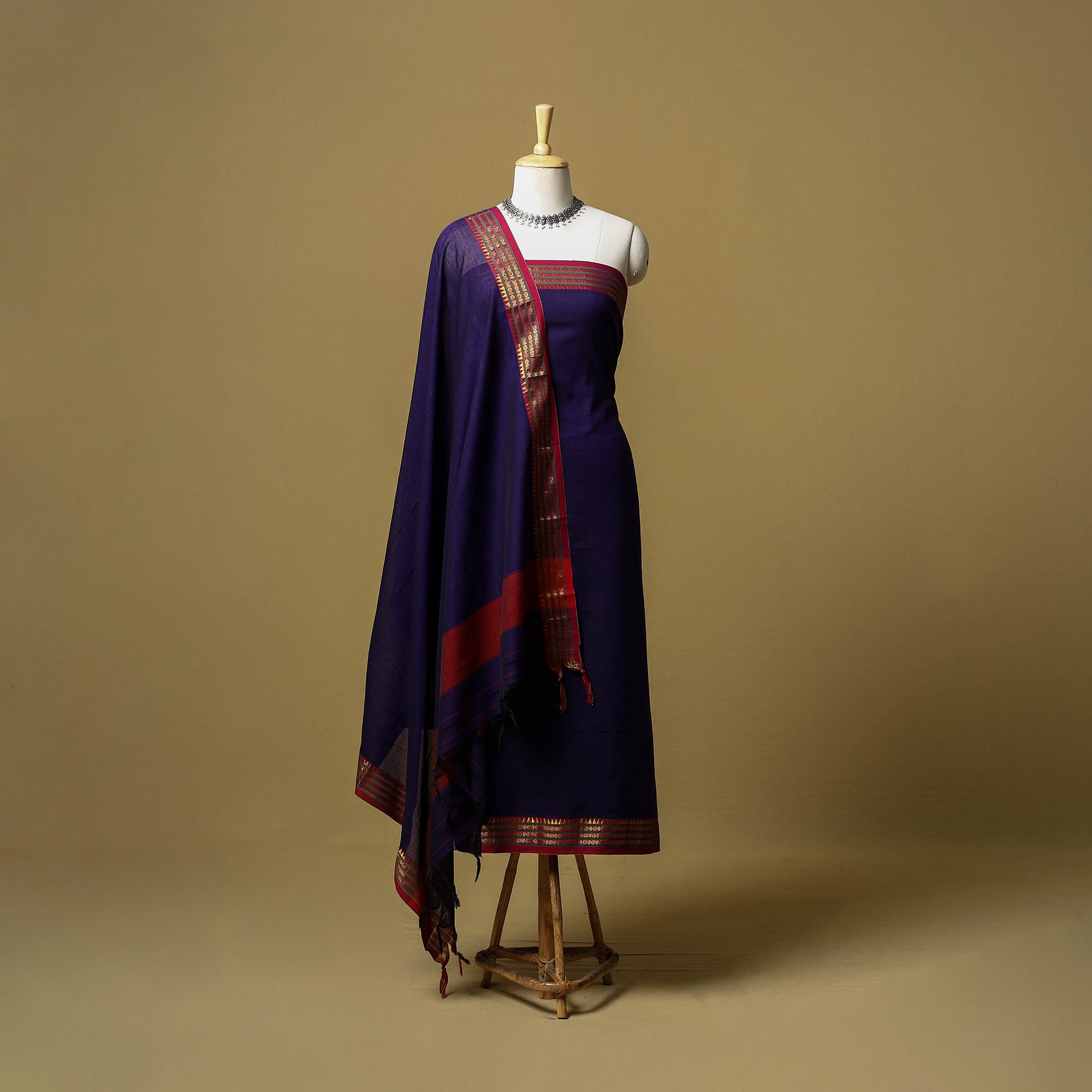 Purple dharwad cotton 3pc unstitched dress material from Karnataka is woven using a traditional method known for its firm texture and intricate border work. The border features fine motifs and patterns that reflect the region’s style. The set includes a beautifully crafted kurta piece, a matching bottom/salwar piece and a coordinating dupatta. Perfect for custom tailoring and everyday wear.