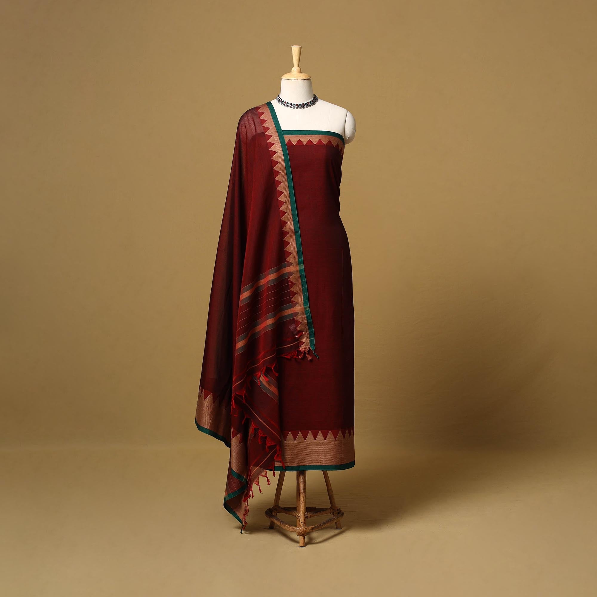 Dharwad cotton 3pc unstitched dress material from Karnataka is woven using a traditional method known for its firm texture and intricate border work. The border features fine motifs and patterns that reflect the region’s style. The set includes a beautifully crafted kurta piece, a matching bottom/salwar piece and a coordinating dupatta. Perfect for custom tailoring and everyday wear.