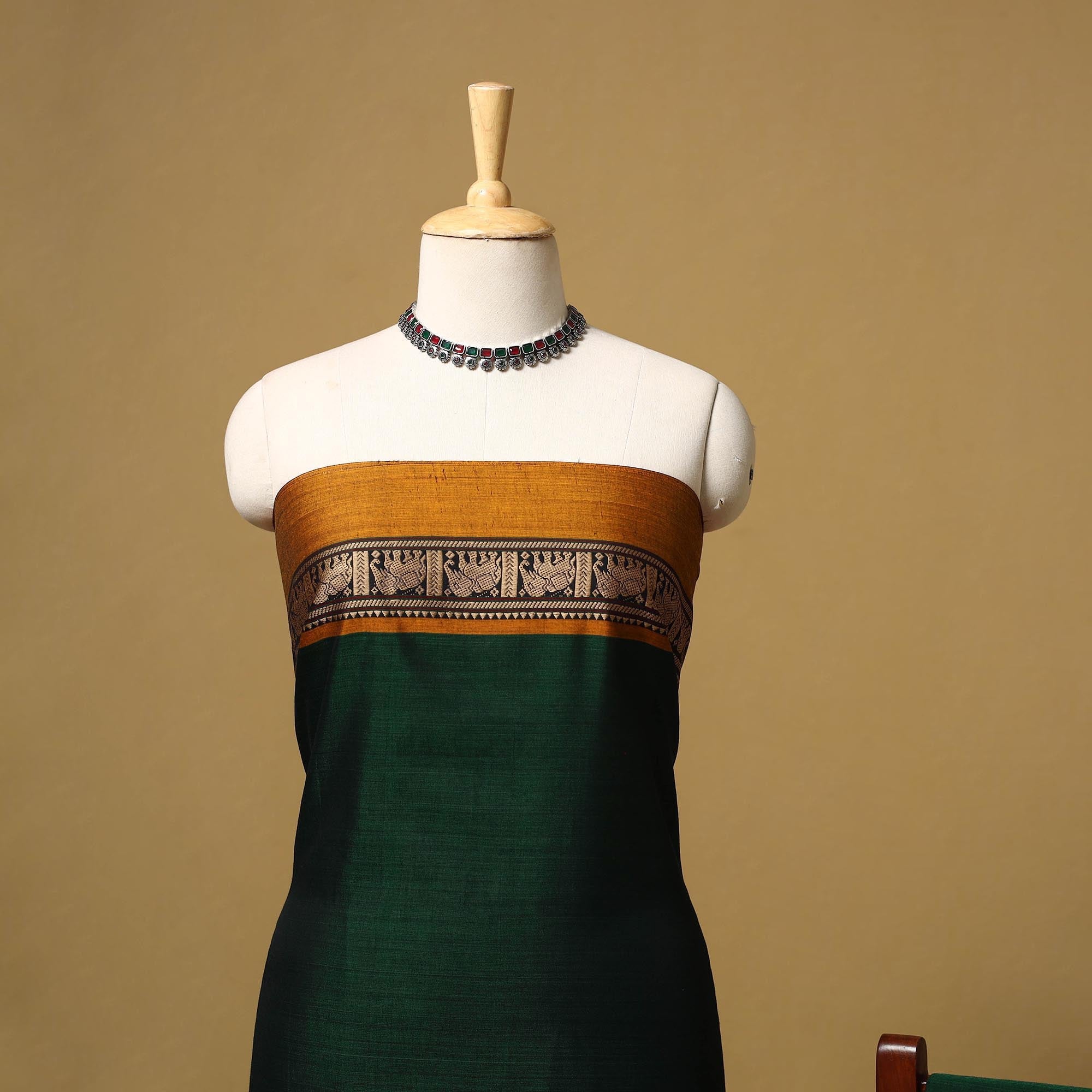 Dharwad cotton 3pc unstitched dress material from Karnataka is woven using a traditional method known for its firm texture and intricate border work. The border features fine motifs and patterns that reflect the region’s style. The set includes a beautifully crafted kurta piece, a matching bottom/salwar piece and a coordinating dupatta. Perfect for custom tailoring and everyday wear.