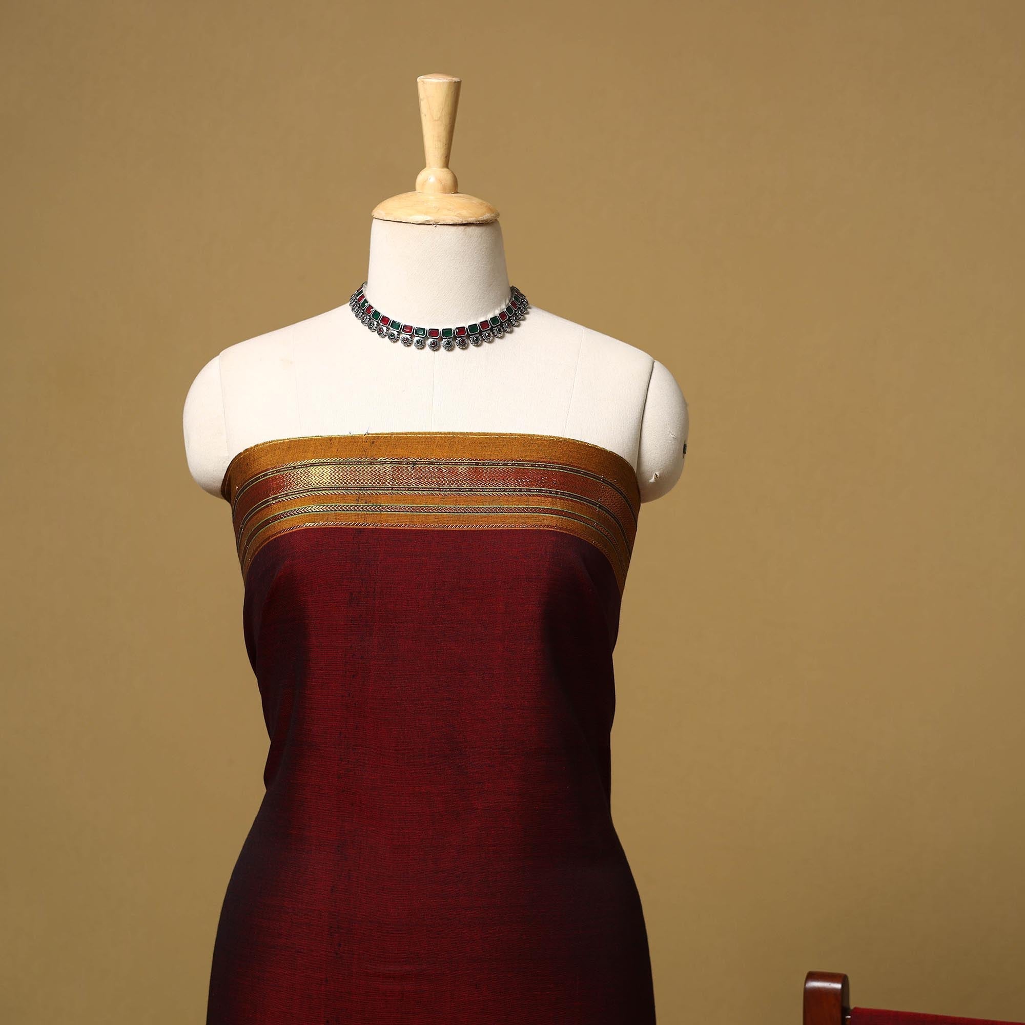 Dharwad cotton 3pc unstitched dress material from Karnataka is woven using a traditional method known for its firm texture and intricate border work. The border features fine motifs and patterns that reflect the region’s style. The set includes a beautifully crafted kurta piece, a matching bottom/salwar piece and a coordinating dupatta. Perfect for custom tailoring and everyday wear.