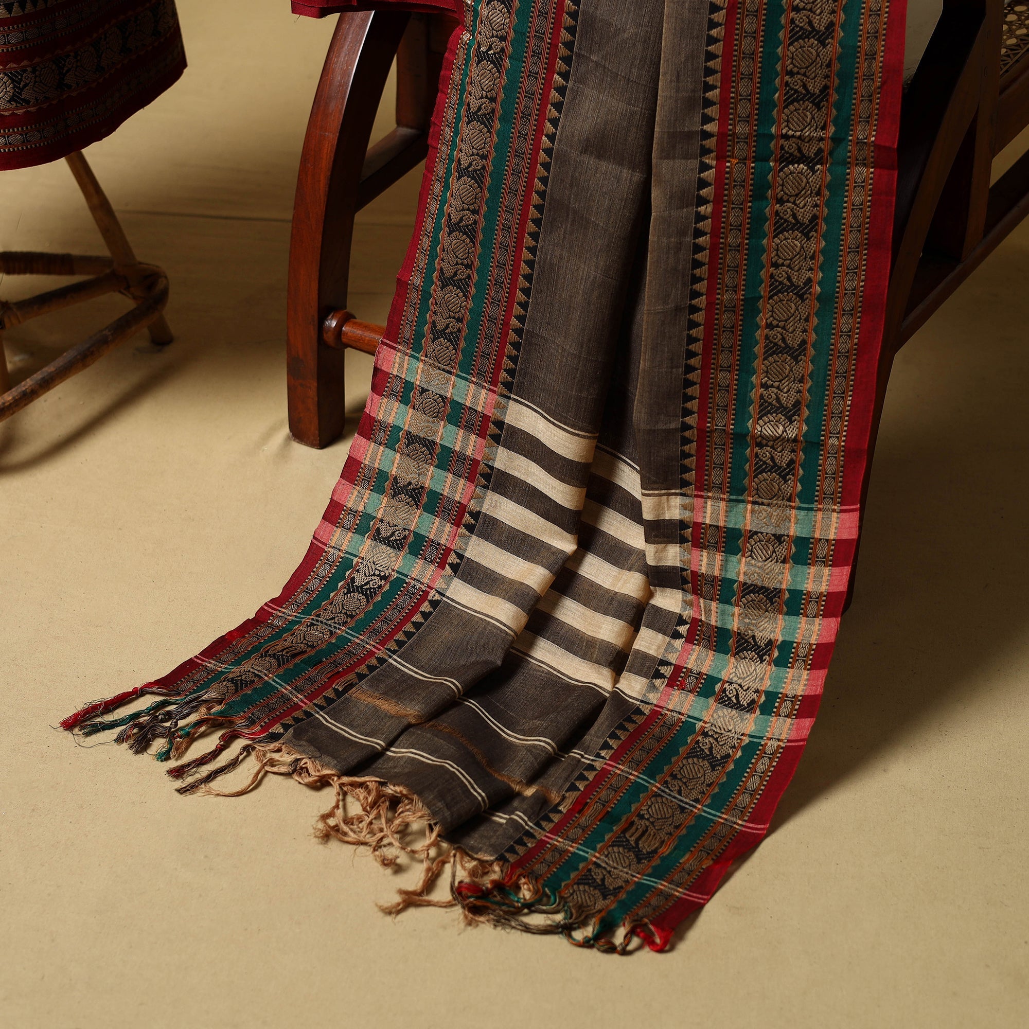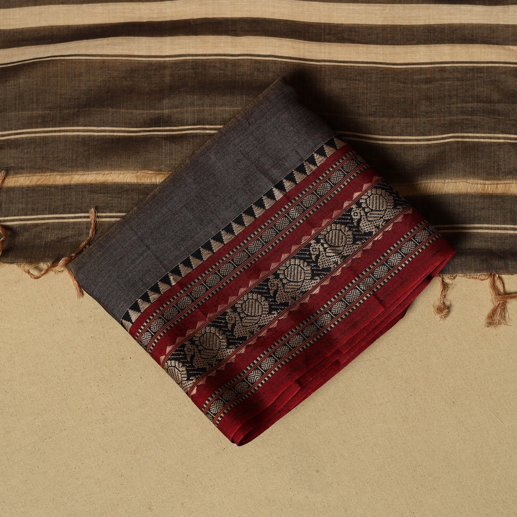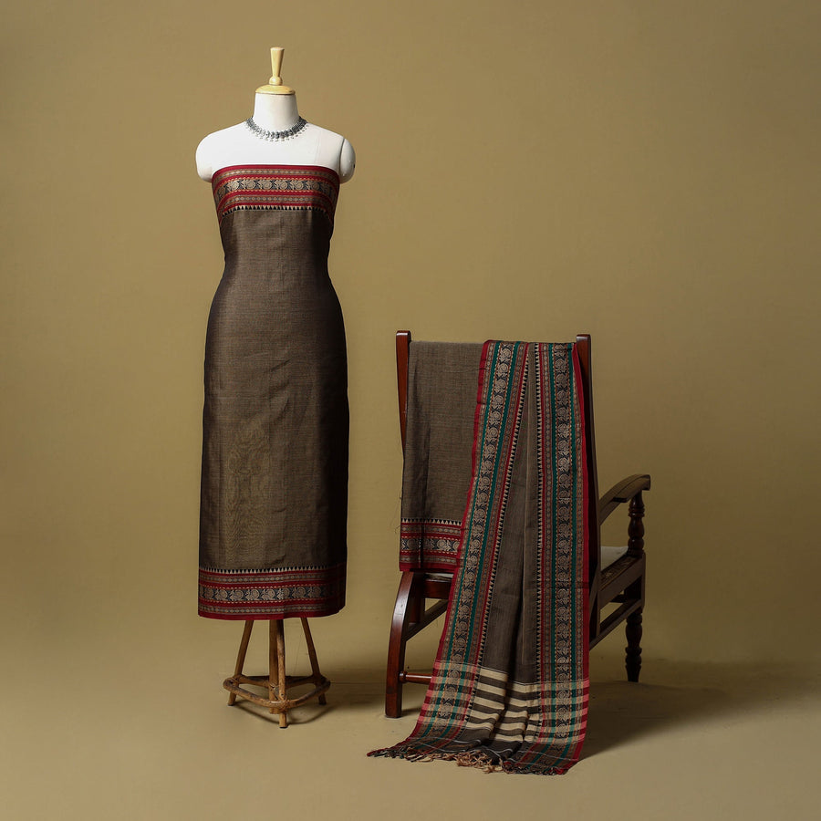 Brown dharwad cotton 3pc unstitched dress material from Karnataka is woven using a traditional method known for its firm texture and intricate border work. The border features fine motifs and patterns that reflect the region’s style. The set includes a beautifully crafted kurta piece, a matching bottom/salwar piece and a coordinating dupatta. Perfect for custom tailoring and everyday wear.