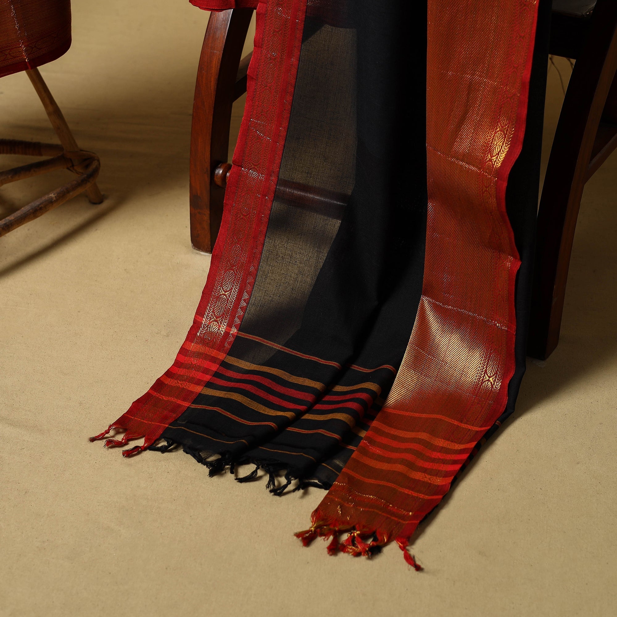 Black dharwad cotton 3pc unstitched dress material from Karnataka is woven using a traditional method known for its firm texture and intricate border work. The border features fine motifs and patterns that reflect the region’s style. The set includes a beautifully crafted kurta piece, a matching bottom/salwar piece and a coordinating dupatta. Perfect for custom tailoring and everyday wear.
