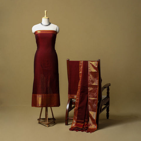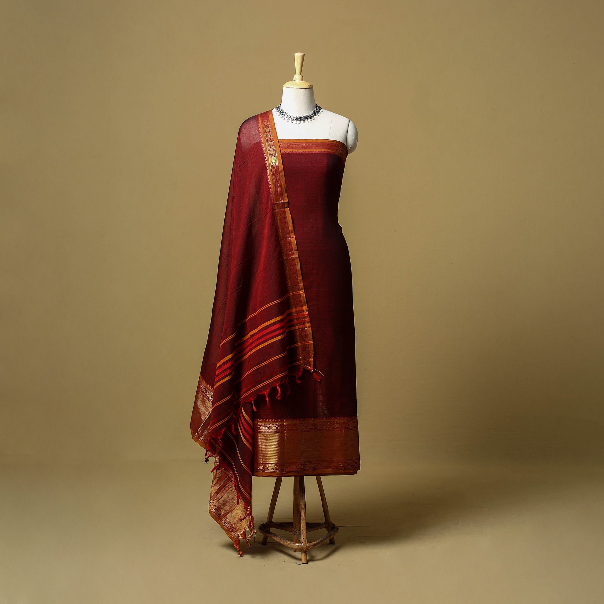 Maroon dharwad cotton 3pc unstitched dress material from Karnataka is woven using a traditional method known for its firm texture and intricate border work. The border features fine motifs and patterns that reflect the region’s style. The set includes a beautifully crafted kurta piece, a matching bottom/salwar piece and a coordinating dupatta. Perfect for custom tailoring and everyday wear.