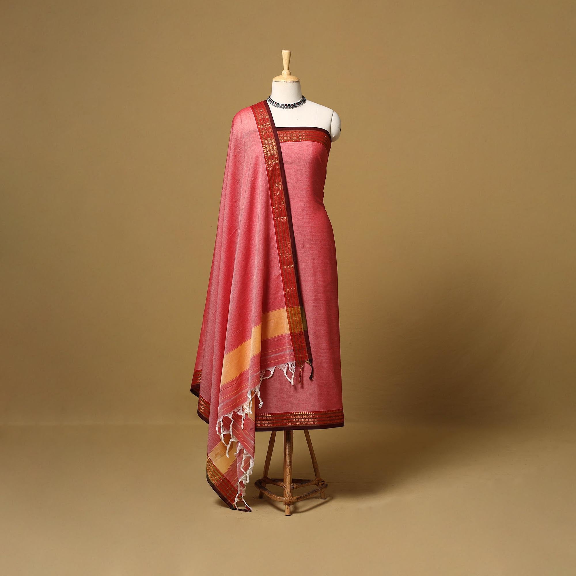 Dharwad cotton 3pc unstitched dress material from Karnataka is woven using a traditional method known for its firm texture and intricate border work. The border features fine motifs and patterns that reflect the region’s style. The set includes a beautifully crafted kurta piece, a matching bottom/salwar piece and a coordinating dupatta. Perfect for custom tailoring and everyday wear.