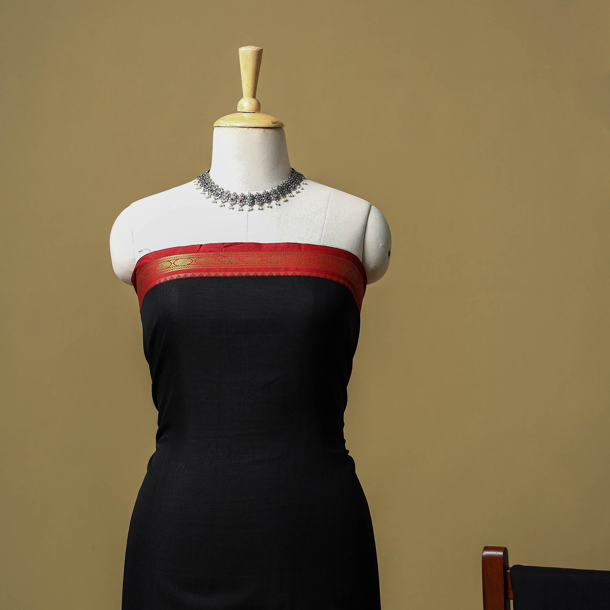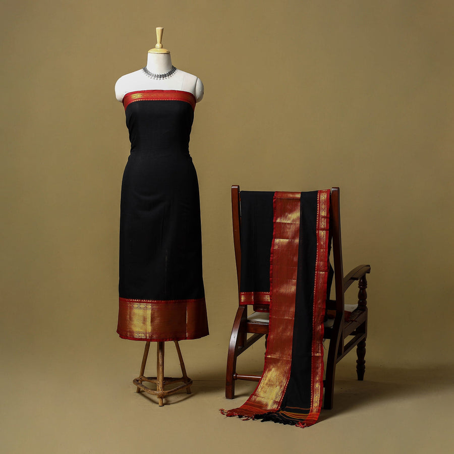 Black dharwad cotton 3pc unstitched dress material from Karnataka is woven using a traditional method known for its firm texture and intricate border work. The border features fine motifs and patterns that reflect the region’s style. The set includes a beautifully crafted kurta piece, a matching bottom/salwar piece and a coordinating dupatta. Perfect for custom tailoring and everyday wear.