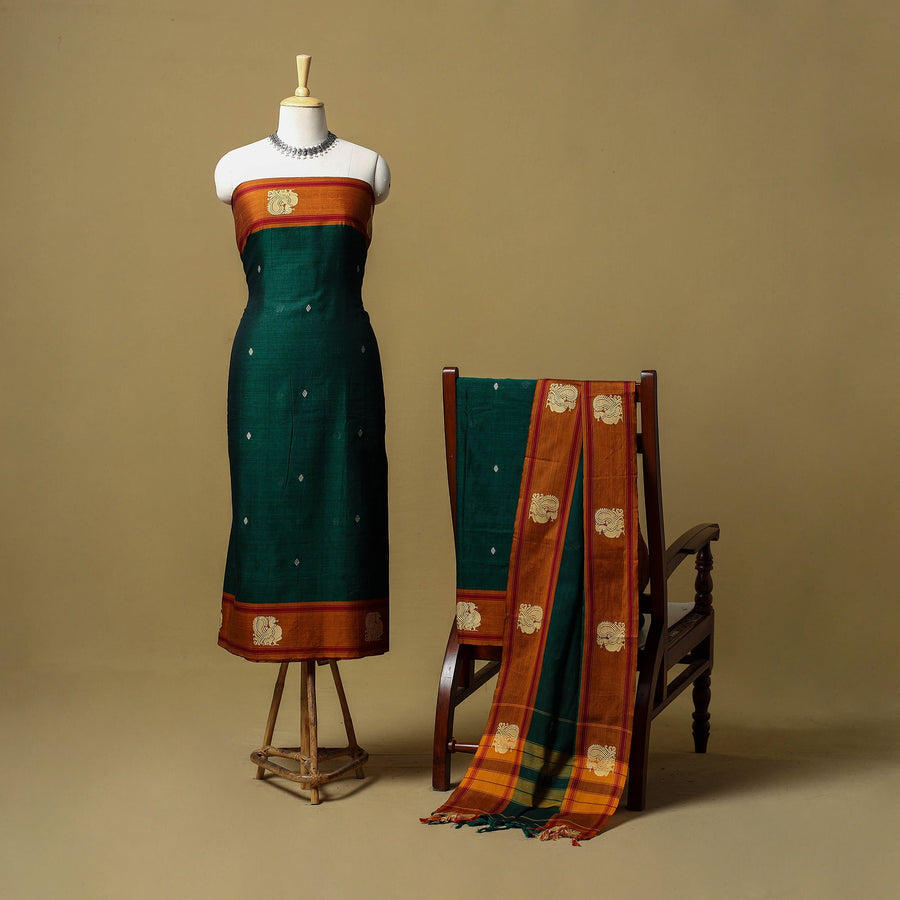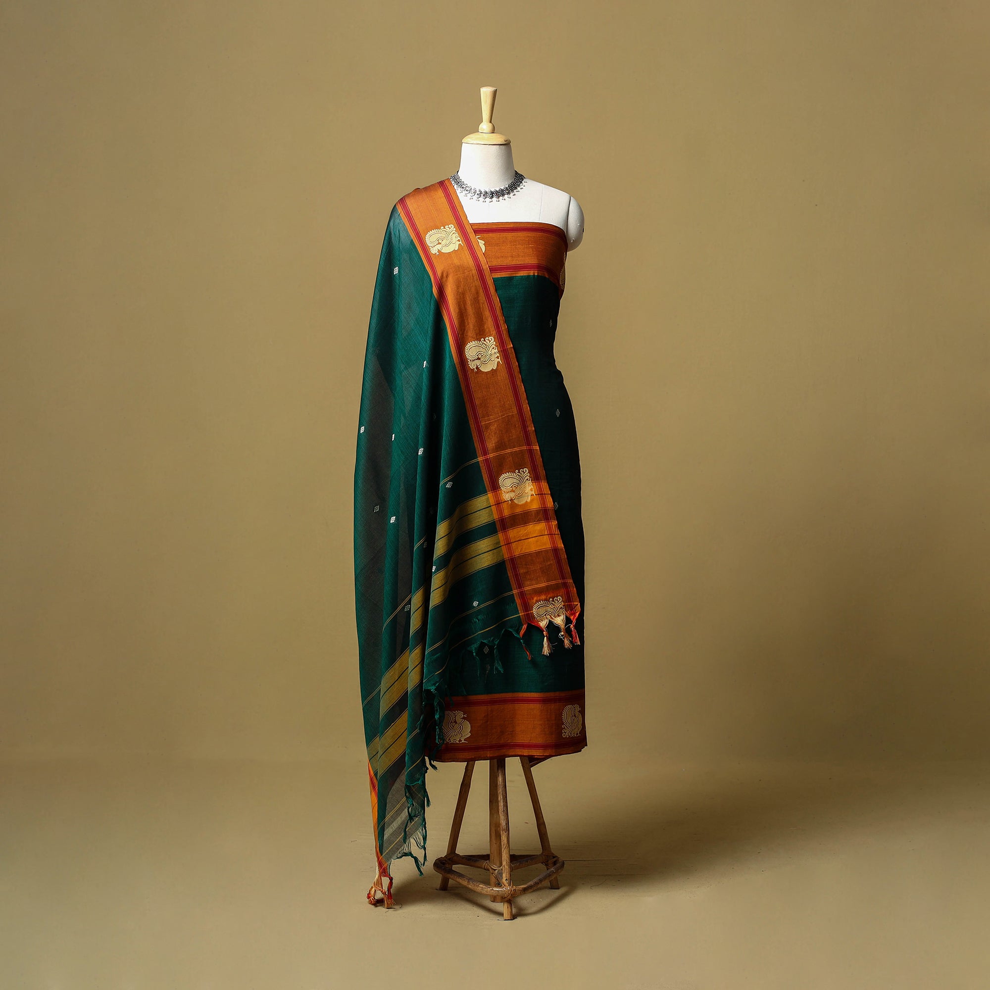 Green dharwad cotton 3pc unstitched dress material from Karnataka is woven using a traditional method known for its firm texture and intricate border work. The border features fine motifs and patterns that reflect the region’s style. The set includes a beautifully crafted kurta piece, a matching bottom/salwar piece and a coordinating dupatta. Perfect for custom tailoring and everyday wear.