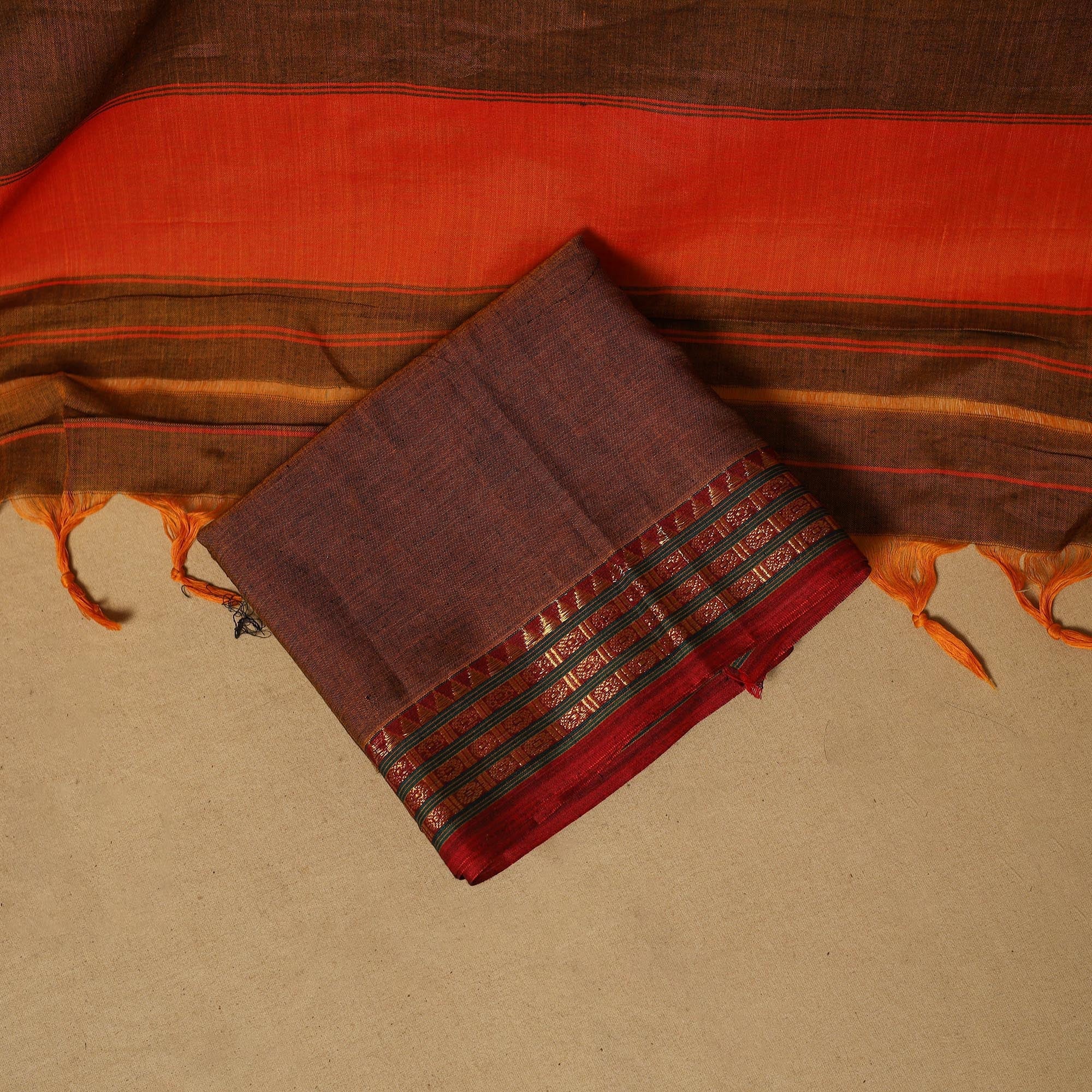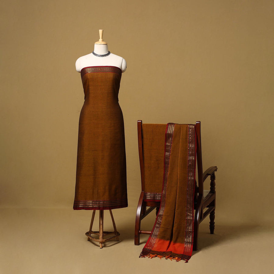 Dharwad cotton 3pc unstitched dress material from Karnataka is woven using a traditional method known for its firm texture and intricate border work. The border features fine motifs and patterns that reflect the region’s style. The set includes a beautifully crafted kurta piece, a matching bottom/salwar piece and a coordinating dupatta. Perfect for custom tailoring and everyday wear.