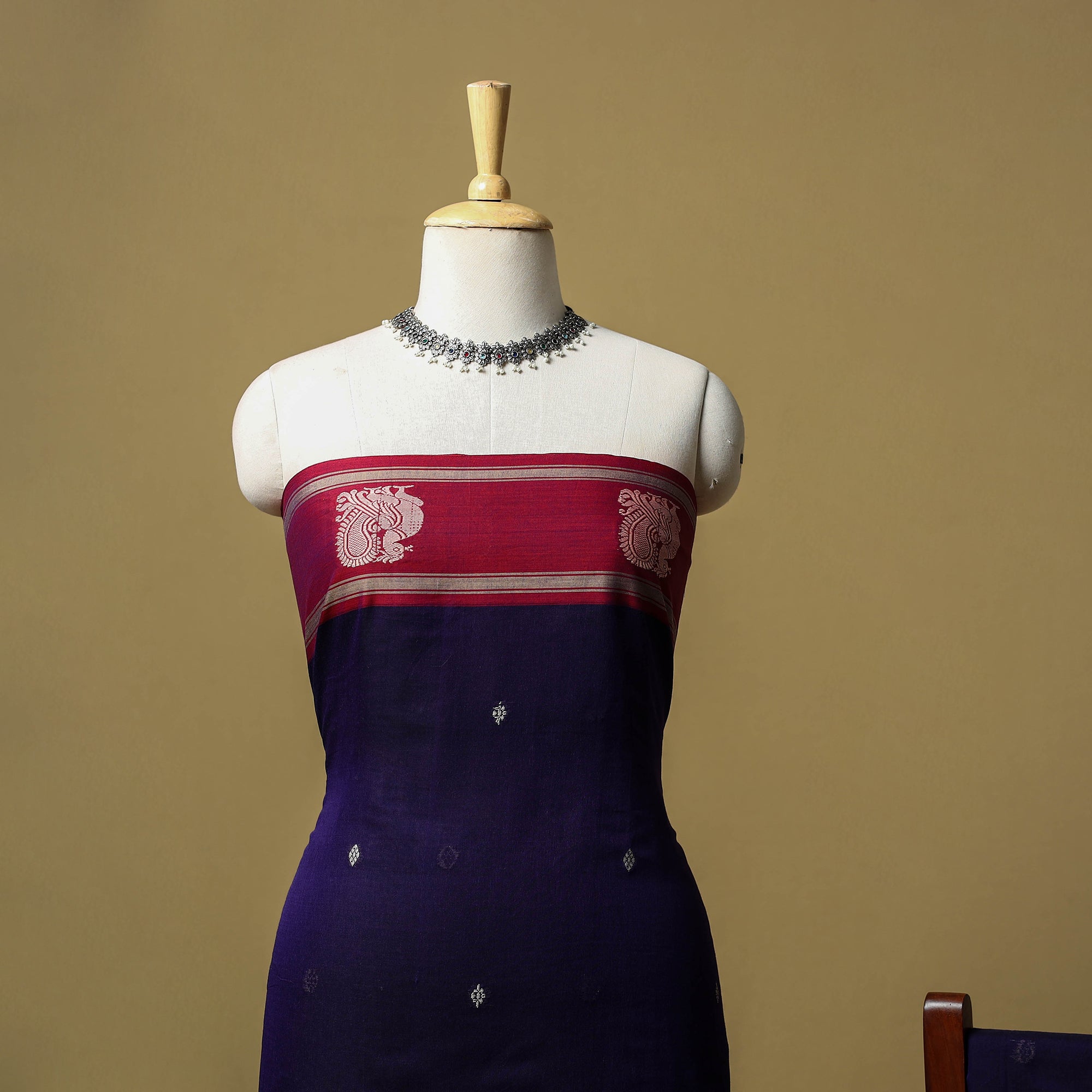 Purple dharwad cotton 3pc unstitched dress material from Karnataka is woven using a traditional method known for its firm texture and intricate border work. The border features fine motifs and patterns that reflect the region’s style. The set includes a beautifully crafted kurta piece, a matching bottom/salwar piece and a coordinating dupatta. Perfect for custom tailoring and everyday wear.