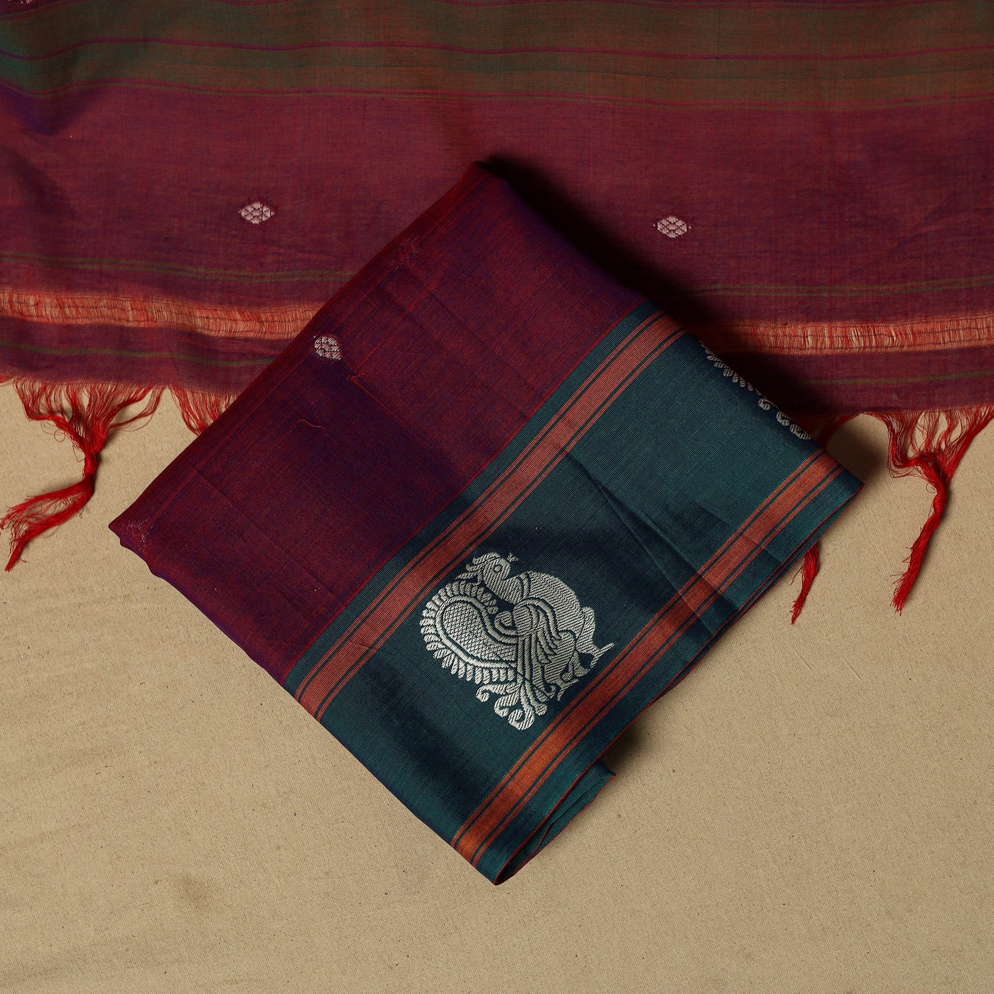 Dharwad cotton 3pc unstitched dress material from Karnataka is woven using a traditional method known for its firm texture and intricate border work. The border features fine motifs and patterns that reflect the region’s style. The set includes a beautifully crafted kurta piece, a matching bottom/salwar piece and a coordinating dupatta. Perfect for custom tailoring and everyday wear.
