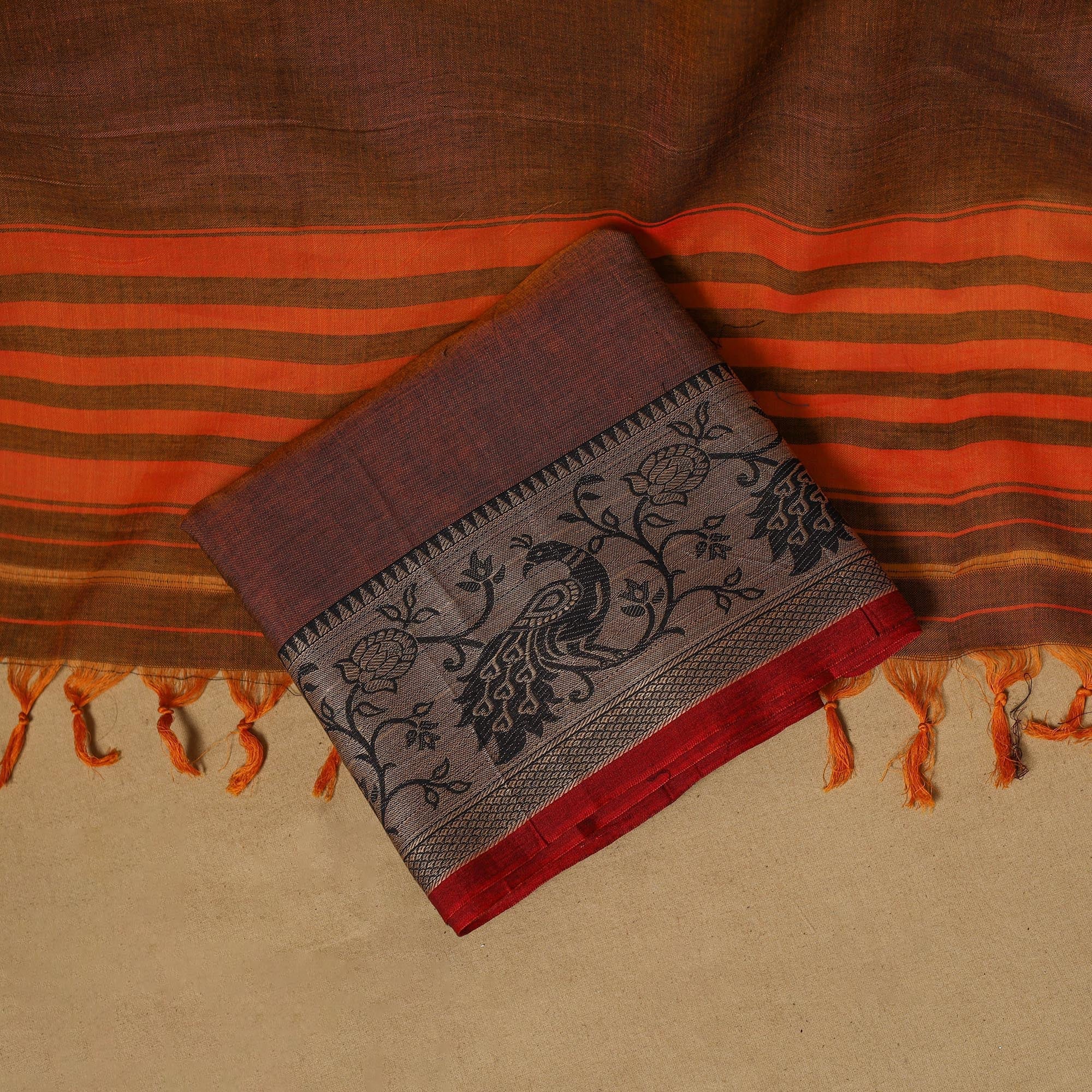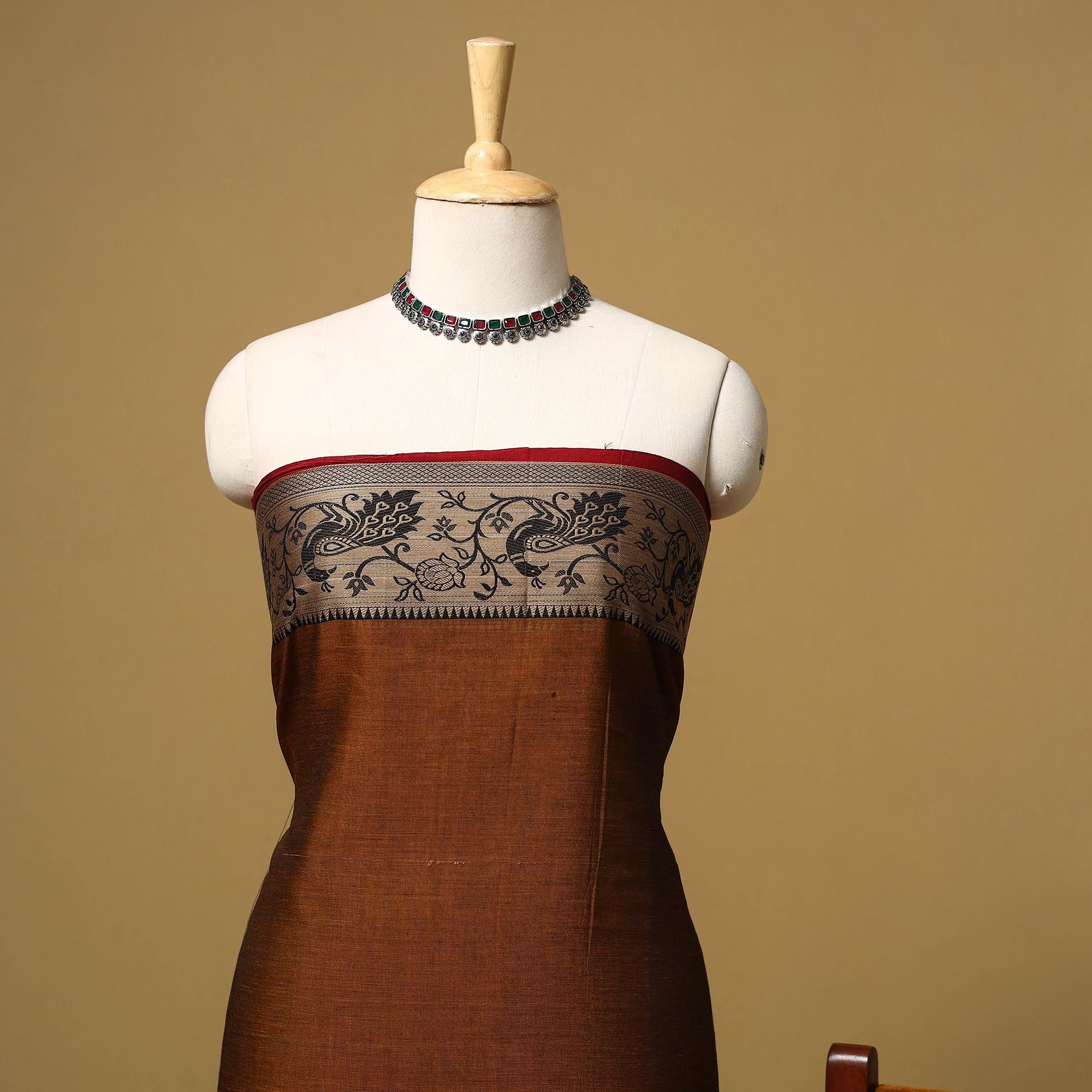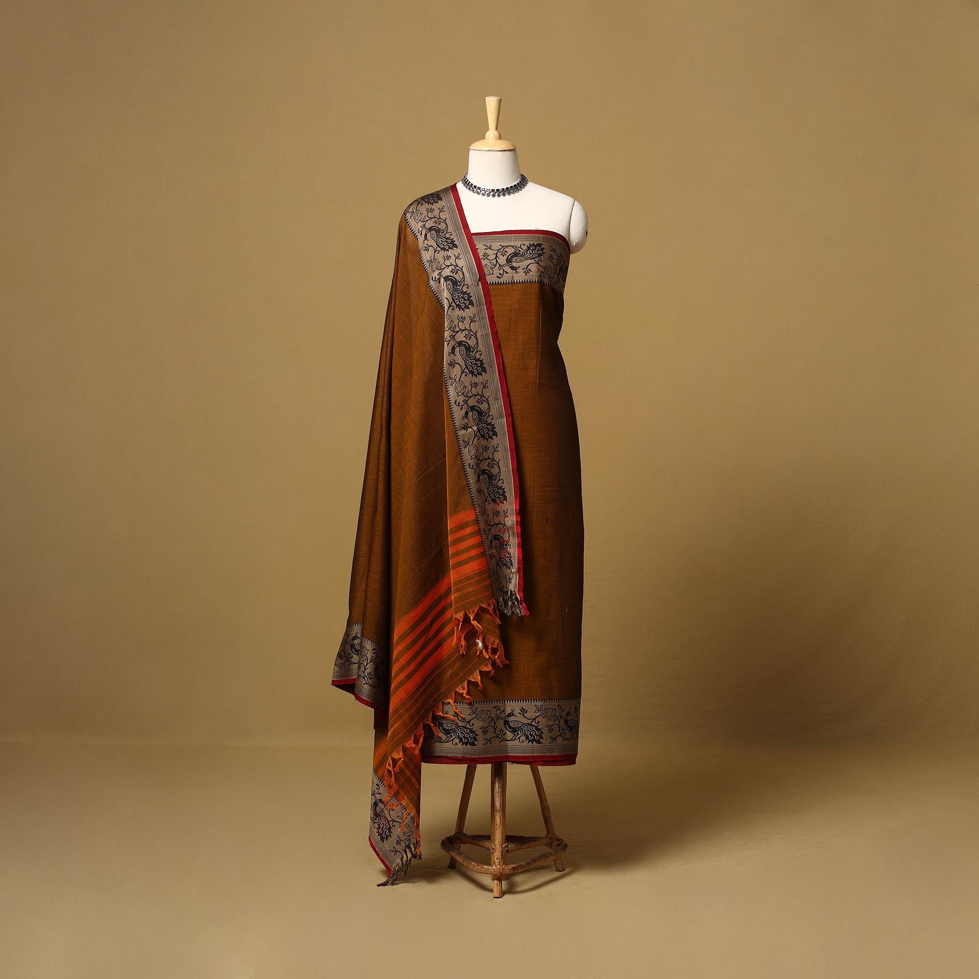 Dharwad cotton 3pc unstitched dress material from Karnataka is woven using a traditional method known for its firm texture and intricate border work. The border features fine motifs and patterns that reflect the region’s style. The set includes a beautifully crafted kurta piece, a matching bottom/salwar piece and a coordinating dupatta. Perfect for custom tailoring and everyday wear.