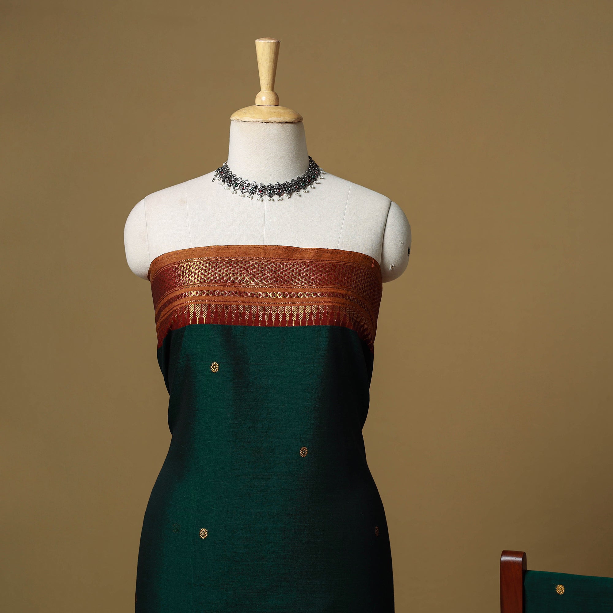 Dharwad cotton 3pc unstitched dress material from Karnataka is woven using a traditional method known for its firm texture and intricate border work. The border features fine motifs and patterns that reflect the region’s style. The set includes a beautifully crafted kurta piece, a matching bottom/salwar piece and a coordinating dupatta. Perfect for custom tailoring and everyday wear.