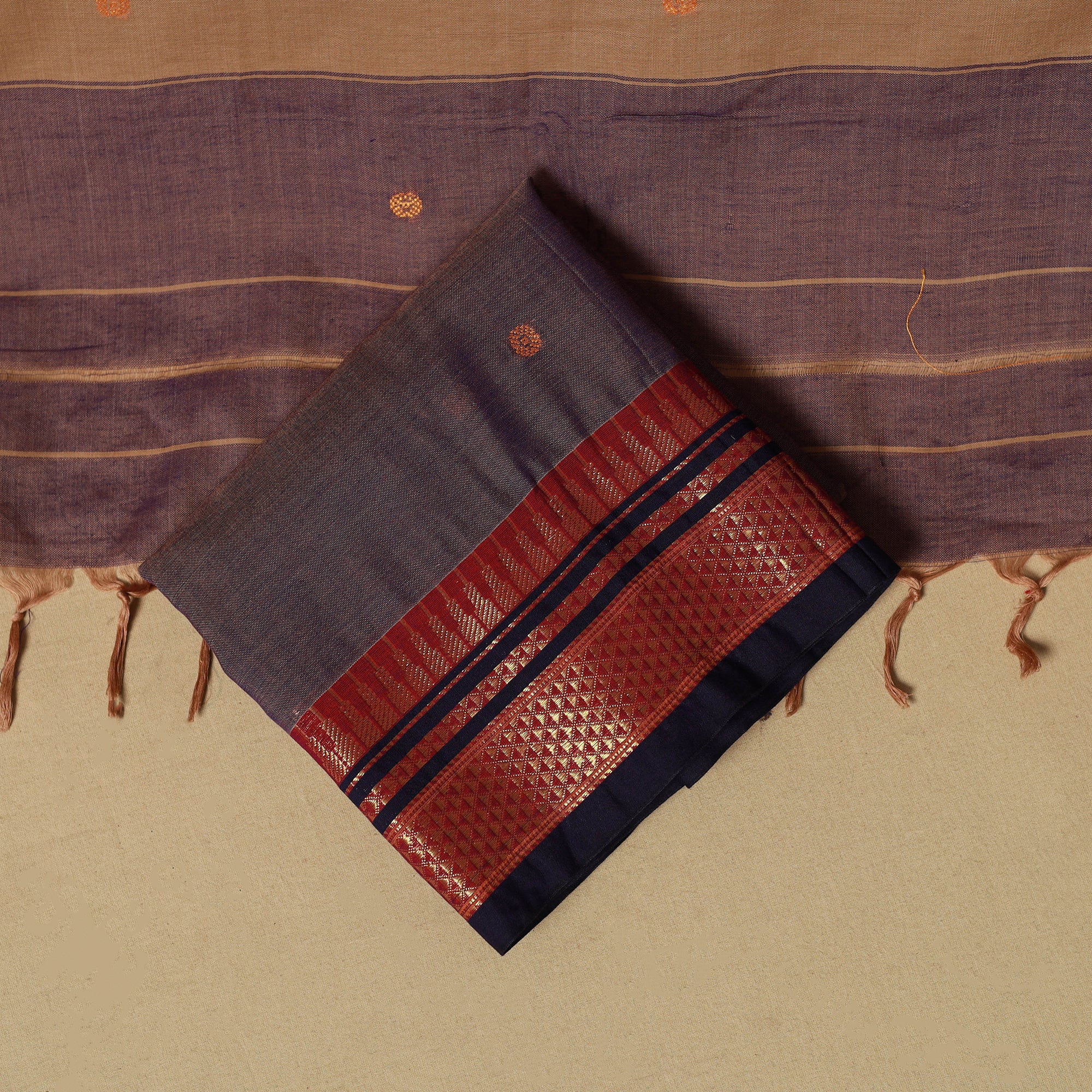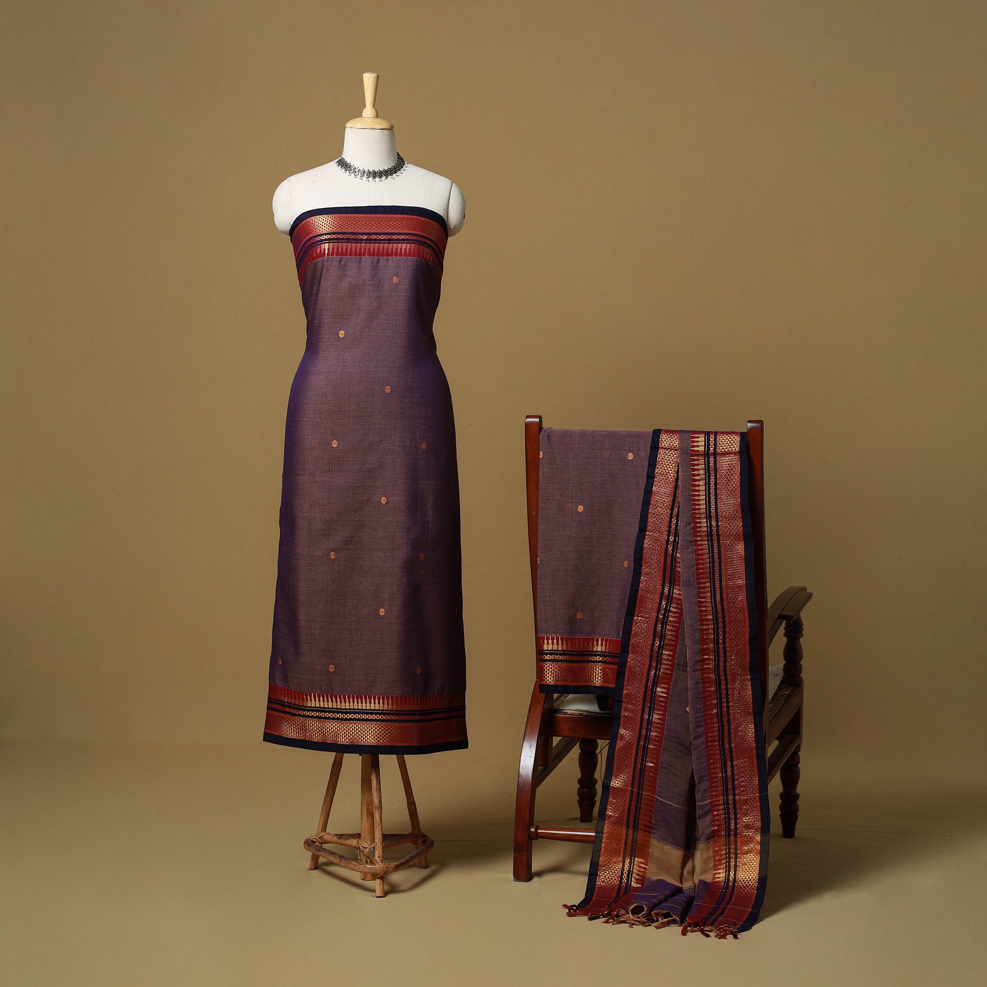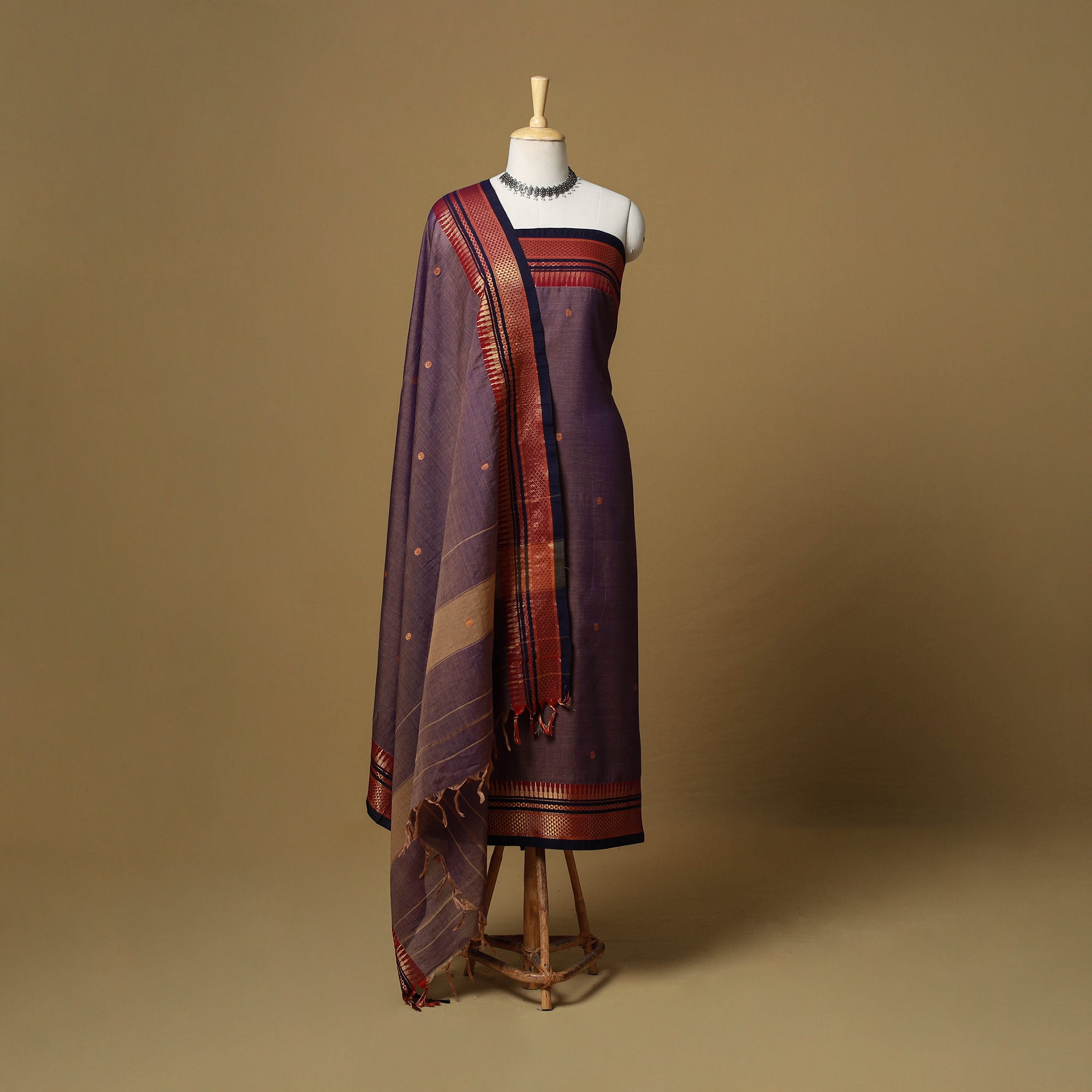 Dharwad cotton 3pc unstitched dress material from Karnataka is woven using a traditional method known for its firm texture and intricate border work. The border features fine motifs and patterns that reflect the region’s style. The set includes a beautifully crafted kurta piece, a matching bottom/salwar piece and a coordinating dupatta. Perfect for custom tailoring and everyday wear.