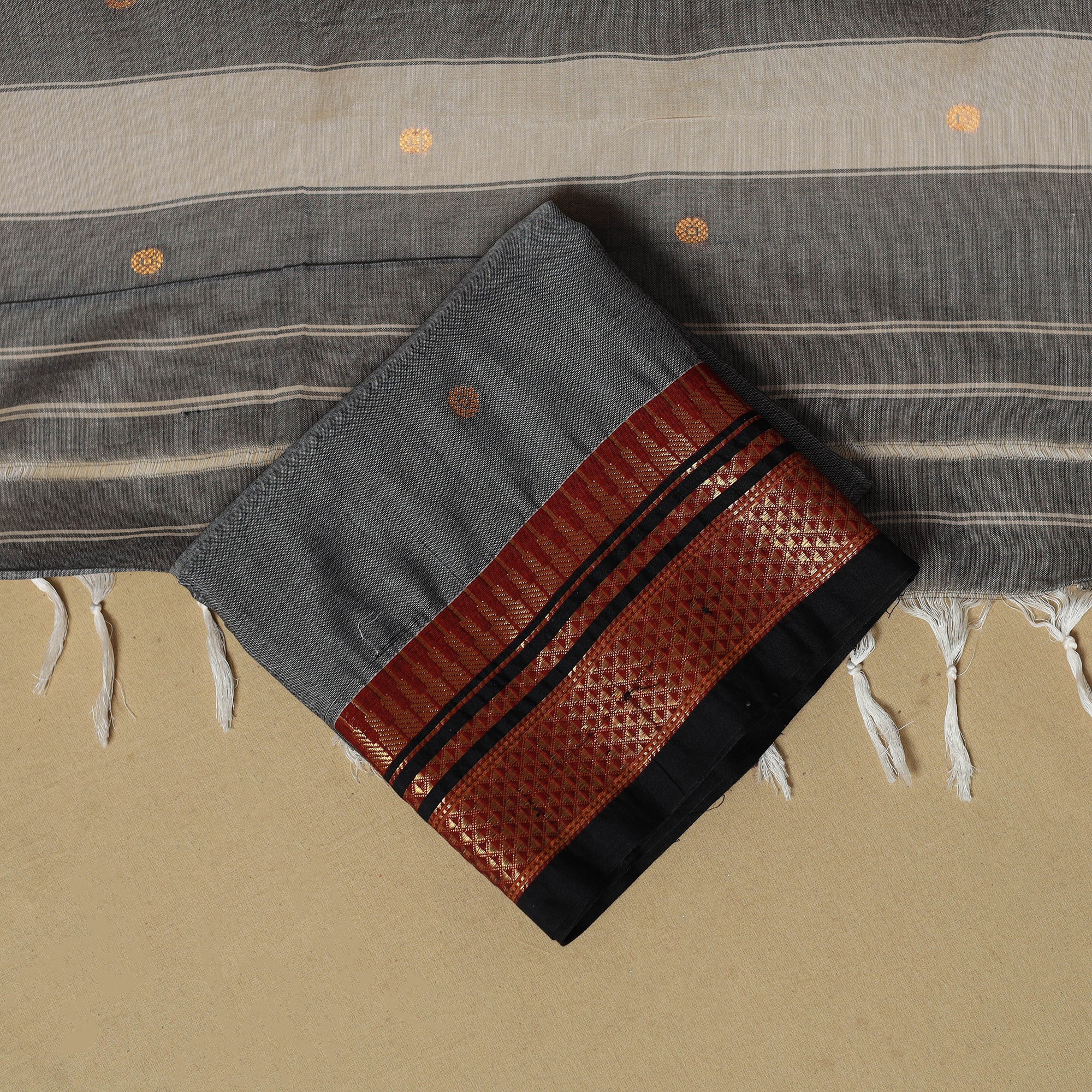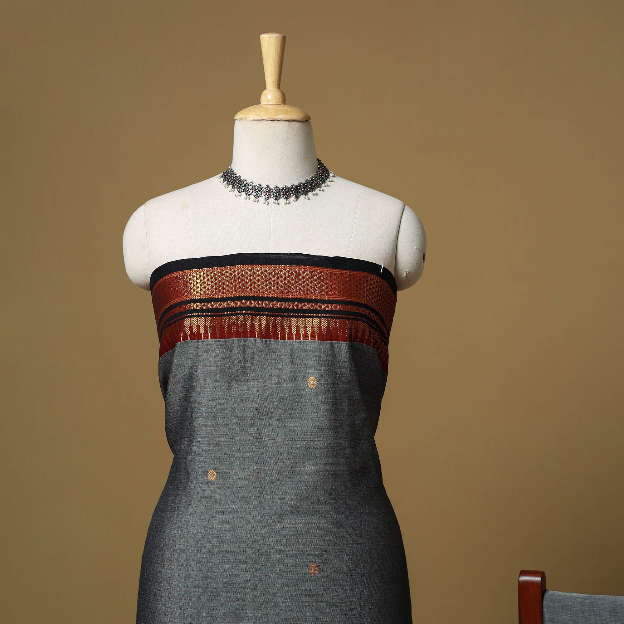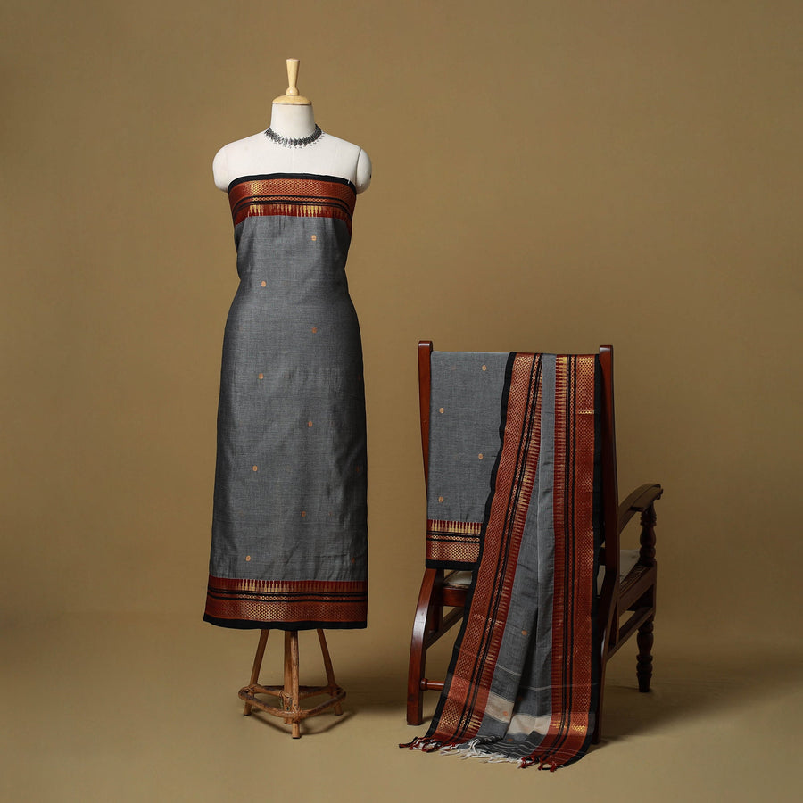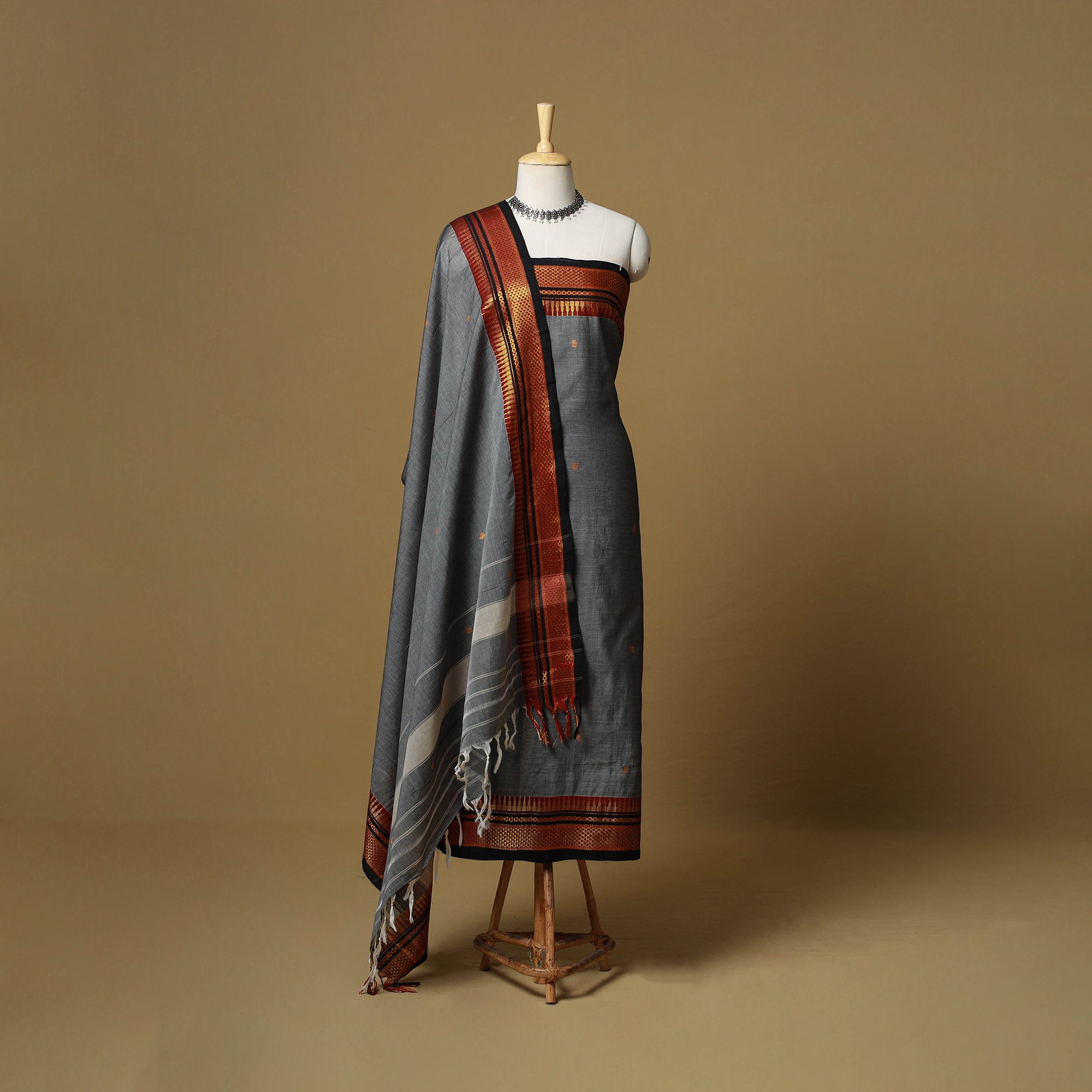 Dharwad cotton 3pc unstitched dress material from Karnataka is woven using a traditional method known for its firm texture and intricate border work. The border features fine motifs and patterns that reflect the region’s style. The set includes a beautifully crafted kurta piece, a matching bottom/salwar piece and a coordinating dupatta. Perfect for custom tailoring and everyday wear.