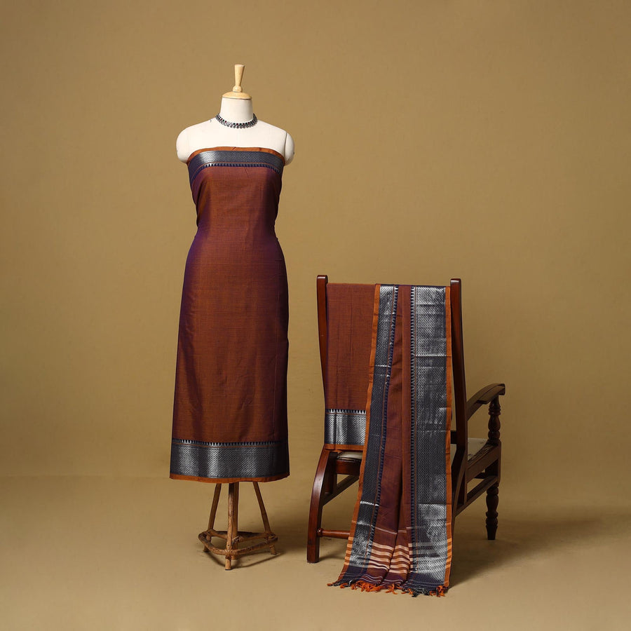 Dharwad cotton 3pc unstitched dress material from Karnataka is woven using a traditional method known for its firm texture and intricate border work. The border features fine motifs and patterns that reflect the region’s style. The set includes a beautifully crafted kurta piece, a matching bottom/salwar piece and a coordinating dupatta. Perfect for custom tailoring and everyday wear.