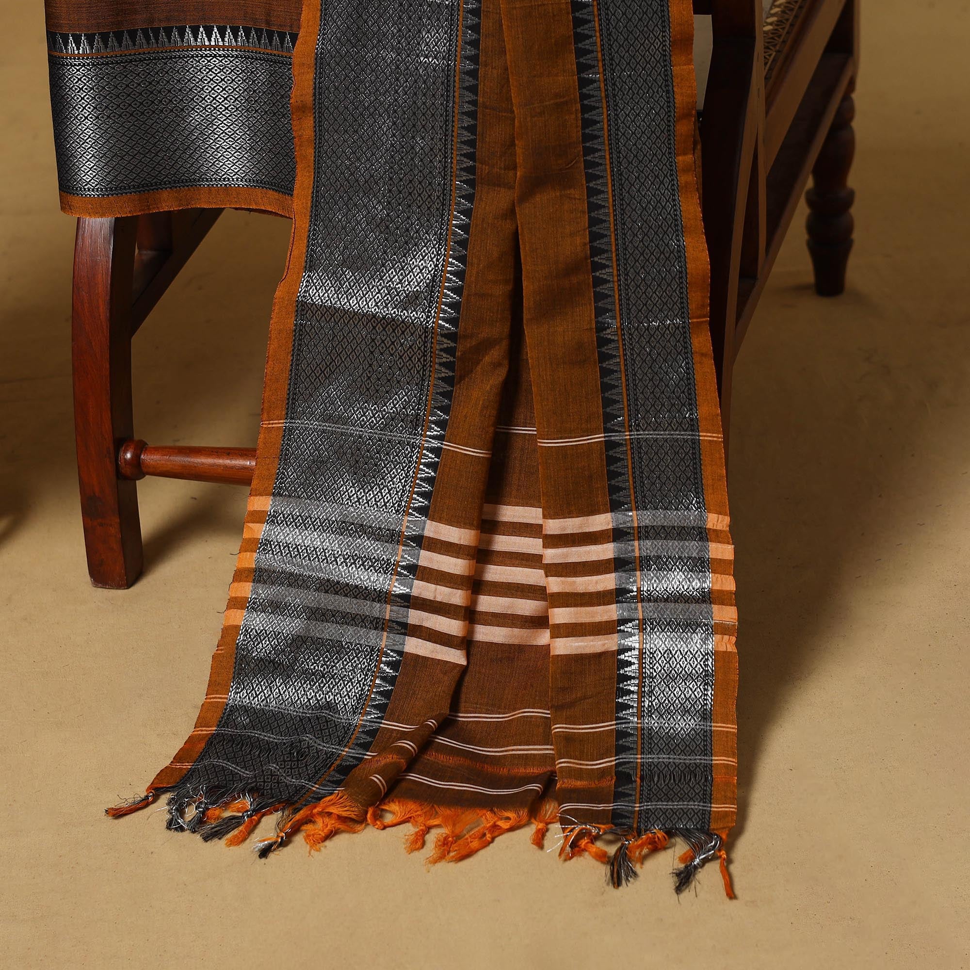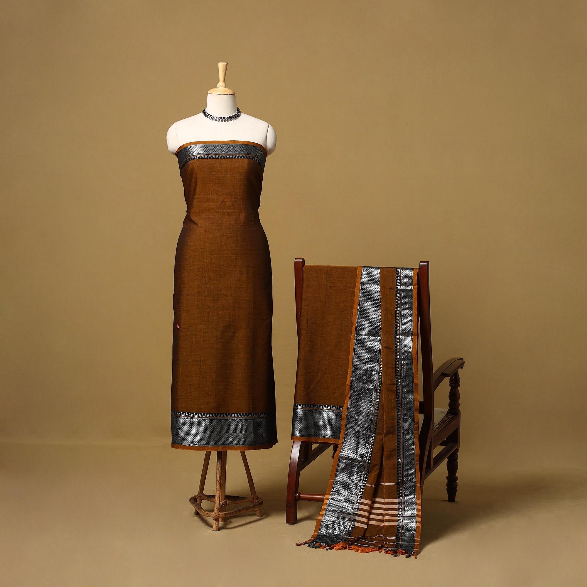 Dharwad cotton 3pc unstitched dress material from Karnataka is woven using a traditional method known for its firm texture and intricate border work. The border features fine motifs and patterns that reflect the region’s style. The set includes a beautifully crafted kurta piece, a matching bottom/salwar piece and a coordinating dupatta. Perfect for custom tailoring and everyday wear.