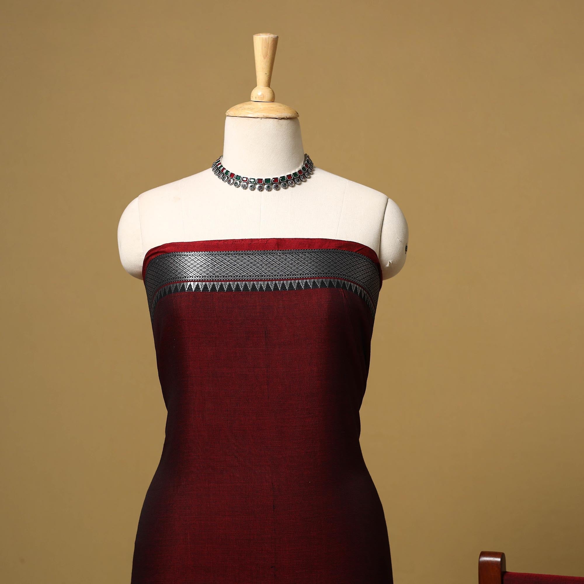 Dharwad cotton 3pc unstitched dress material from Karnataka is woven using a traditional method known for its firm texture and intricate border work. The border features fine motifs and patterns that reflect the region’s style. The set includes a beautifully crafted kurta piece, a matching bottom/salwar piece and a coordinating dupatta. Perfect for custom tailoring and everyday wear.